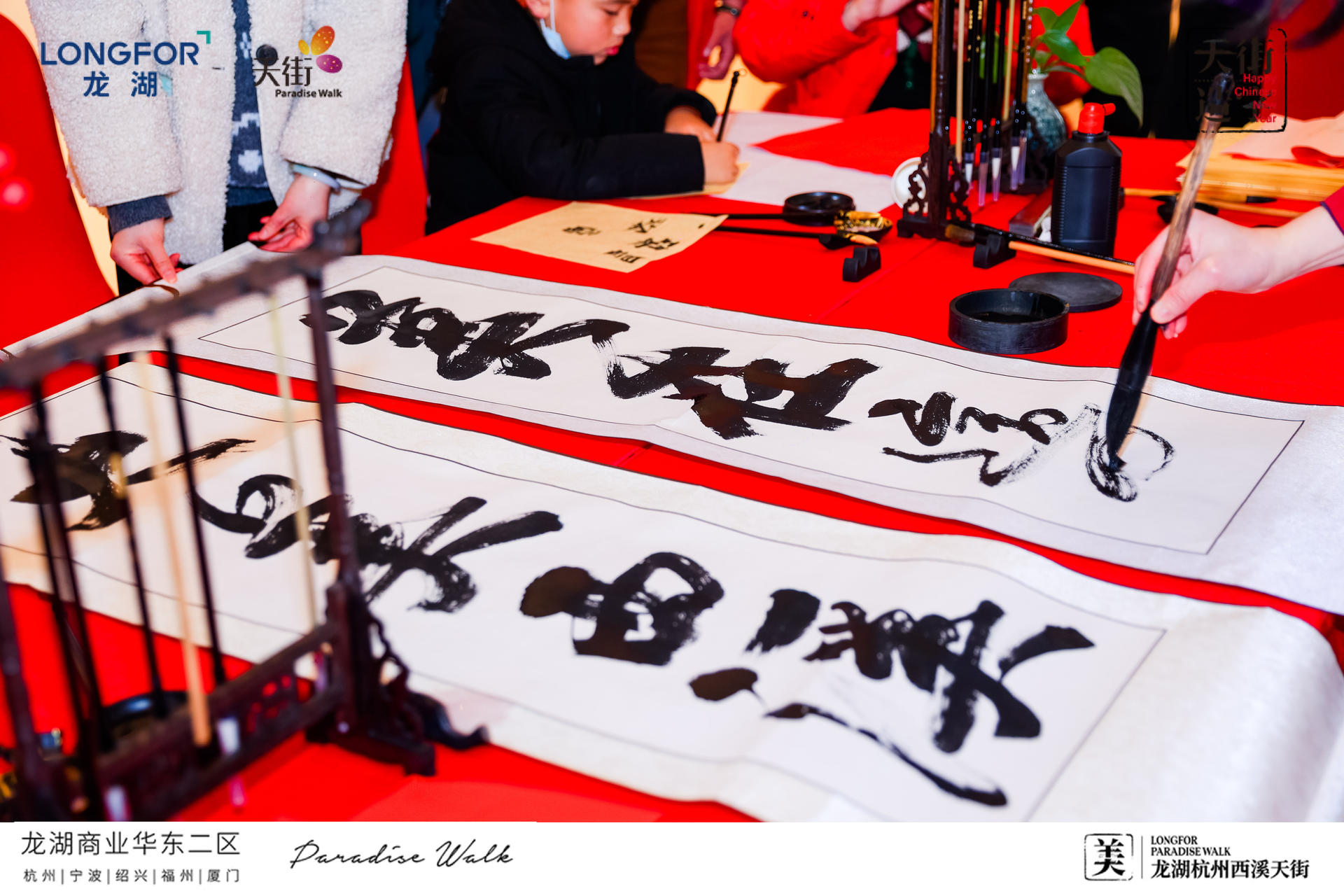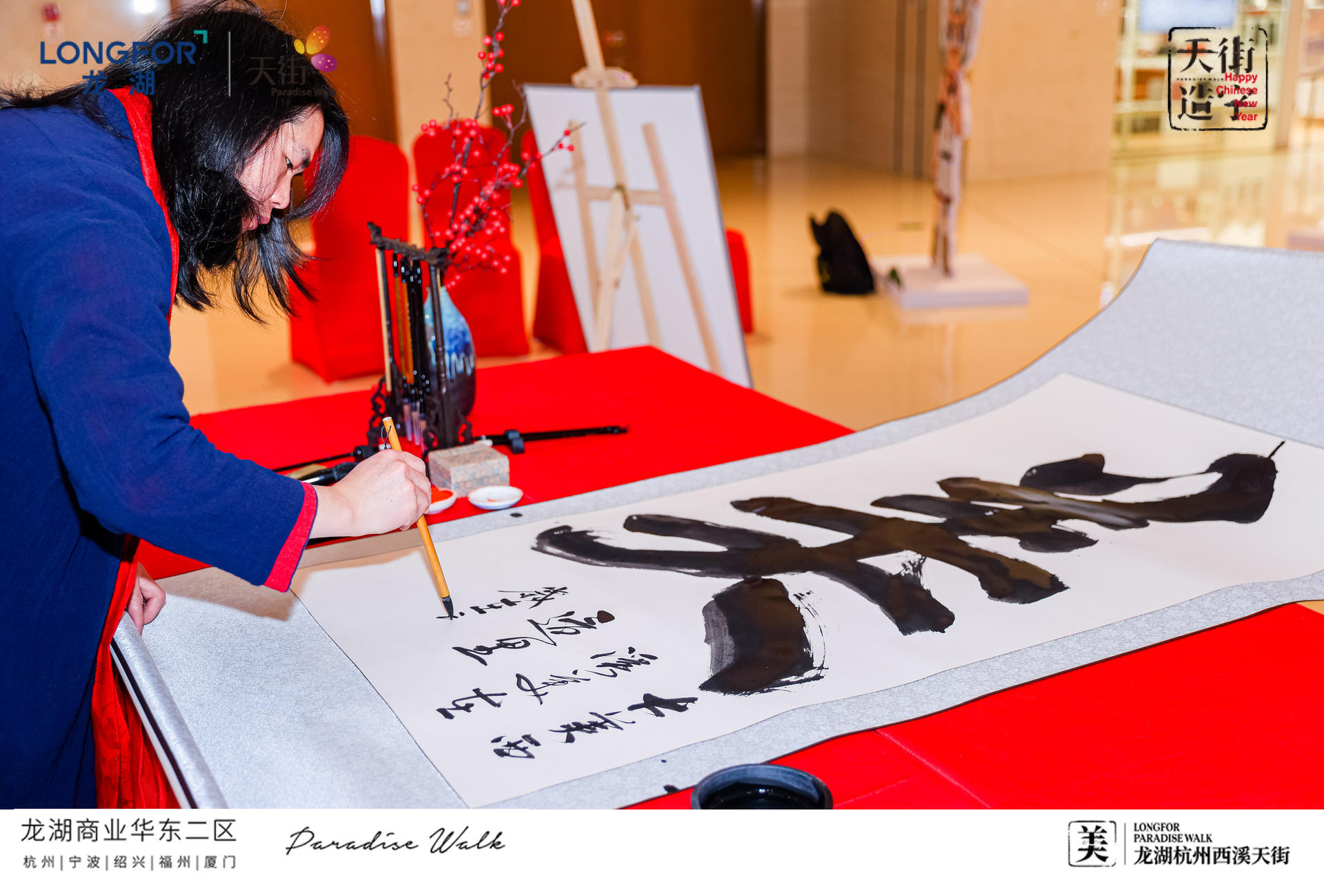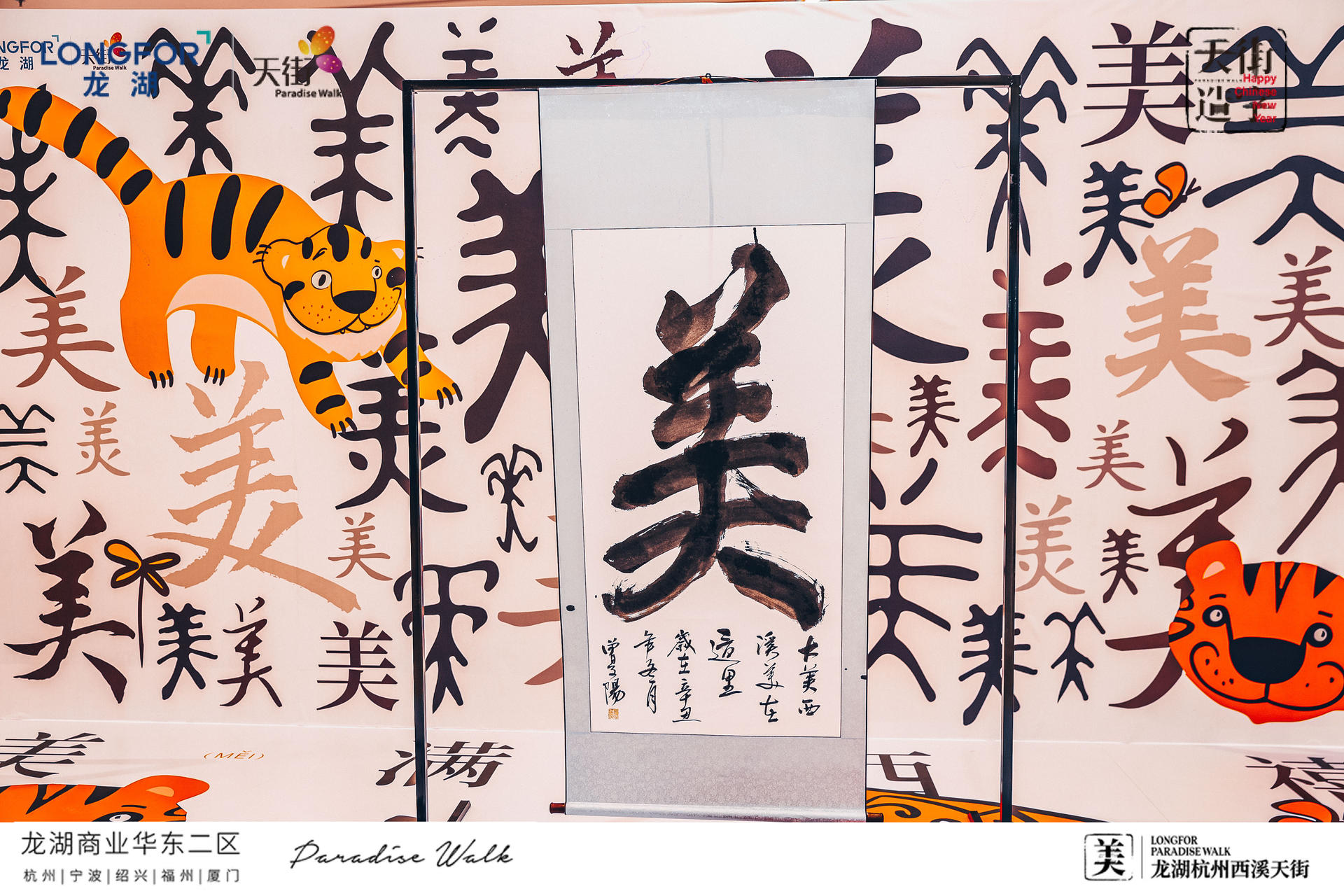 现场还设有趣味满分的互动装置,好运大转盘、祈福纳祥、绝美灯笼通道,打卡快乐,砸掉不开心一起辞旧迎新!新年必备的仪式感,研新墨、铺红纸、写春联!现场还联动青年书法家曾志夏团队,现场题写巨型“美”字,许下新年美好祈愿,感受新年氛围。