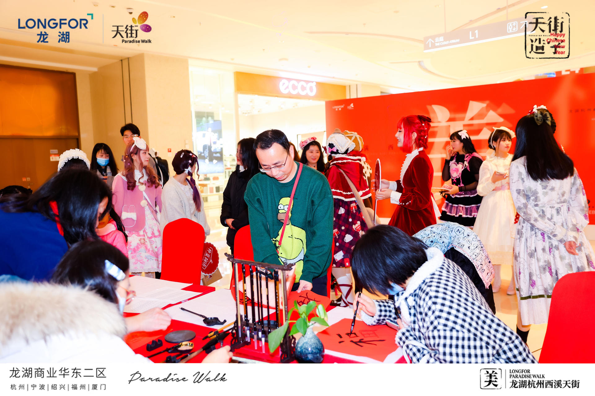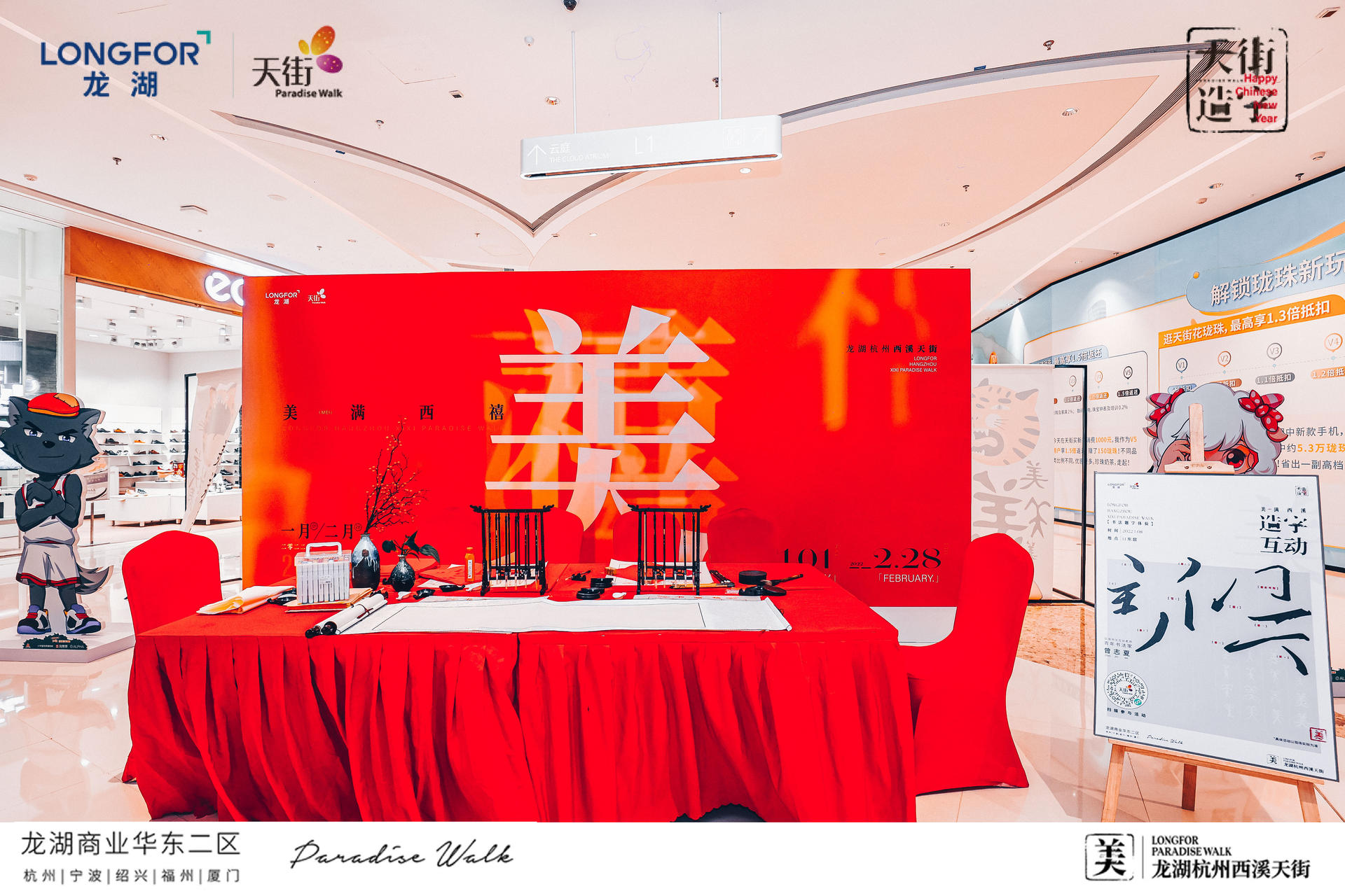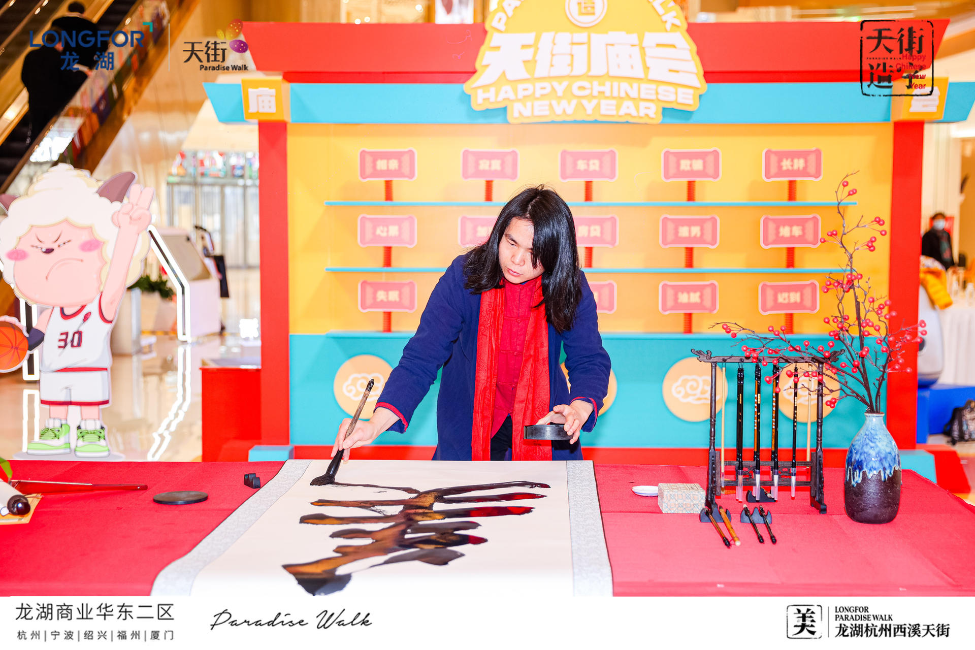 现场还设有趣味满分的互动装置,好运大转盘、祈福纳祥、绝美灯笼通道,打卡快乐,砸掉不开心一起辞旧迎新!新年必备的仪式感,研新墨、铺红纸、写春联!现场还联动青年书法家曾志夏团队,现场题写巨型“美”字,许下新年美好祈愿,感受新年氛围。