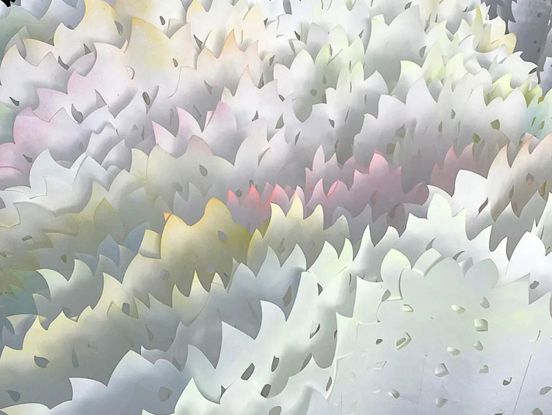 纸雕装置以华夏传统水墨为根,当代文化为桢干,艺术家马文标志性的可折叠蜂巢结构纸雕将中国传统的手工纸拉花透过激光雕刻呈现。纸雕作品融汇传统、科技、哲学、自然和人文文化历史,让观赏者以崭新角度卧游水墨之美的同时,沉浸于多元艺术场域。