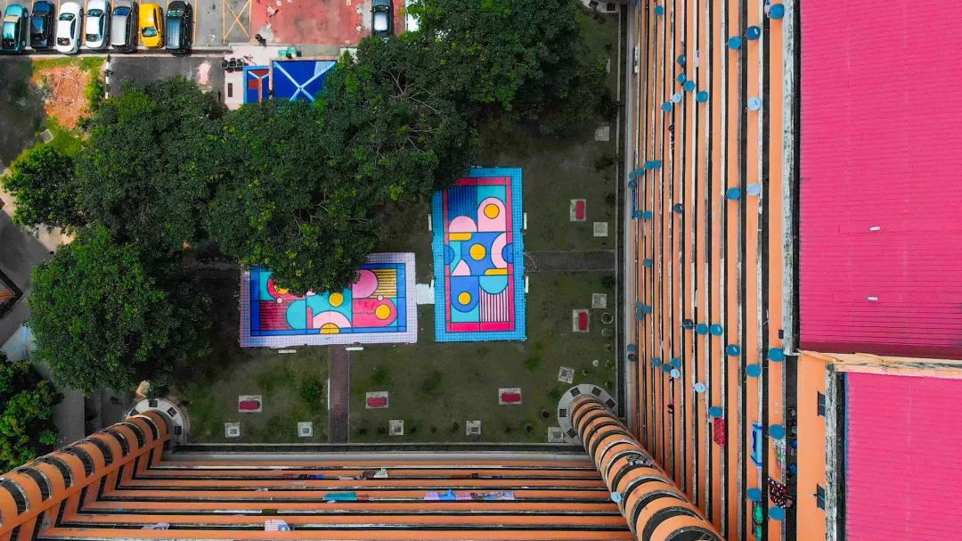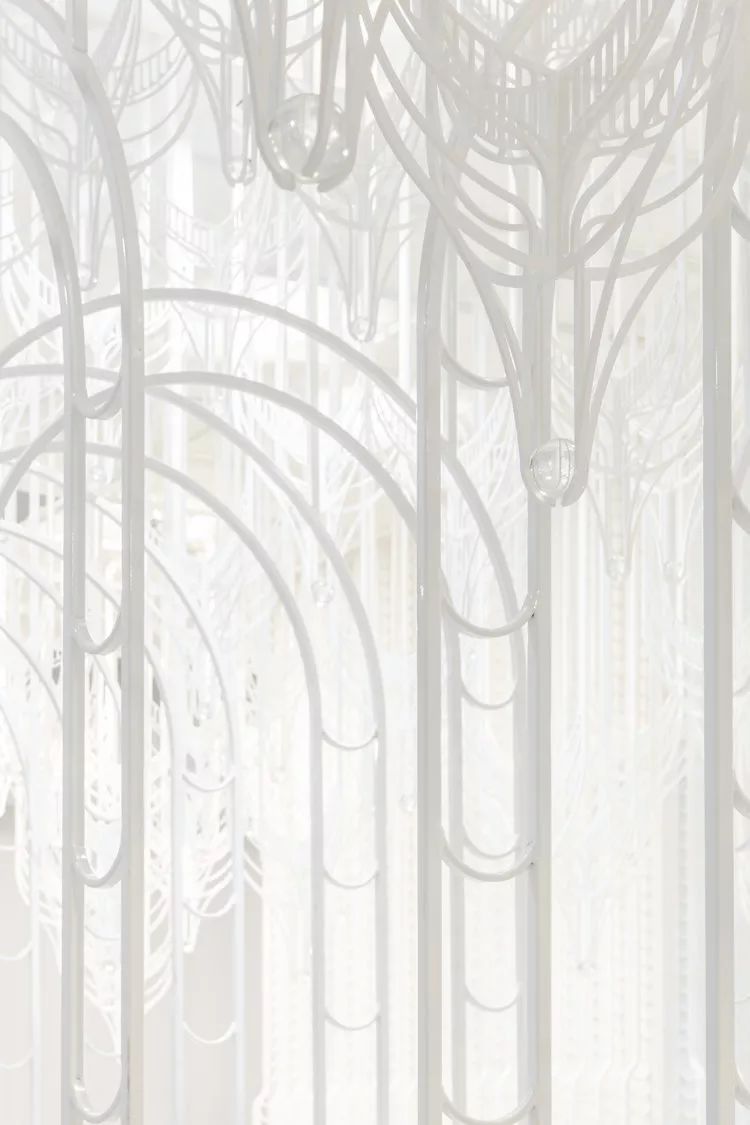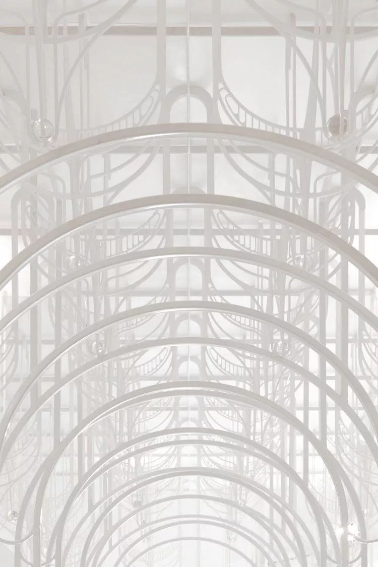 该装置配置了模块化结构,用于投放风筝,这是一种常见的节日制作。充满活力的彩色琴弦从风筝的身体包围,结构延伸到中庭。在间隙和拱门之间和之间编织,色彩缤纷的字符串有趣地邀请您体验轻盈和透明的视觉门户。