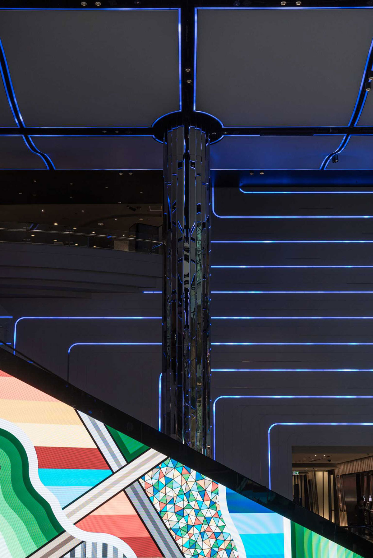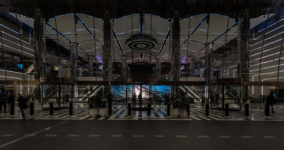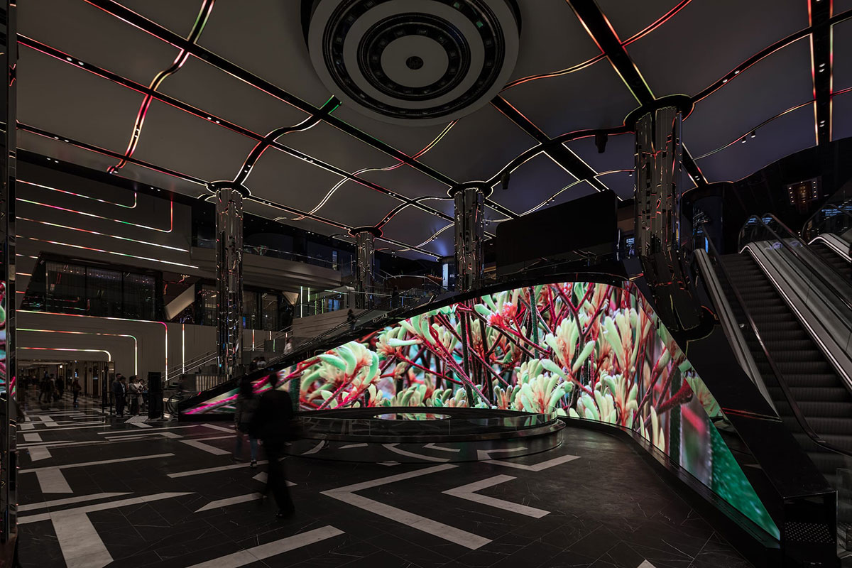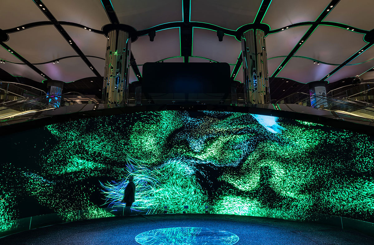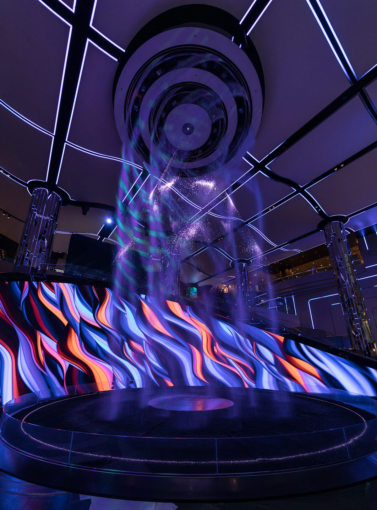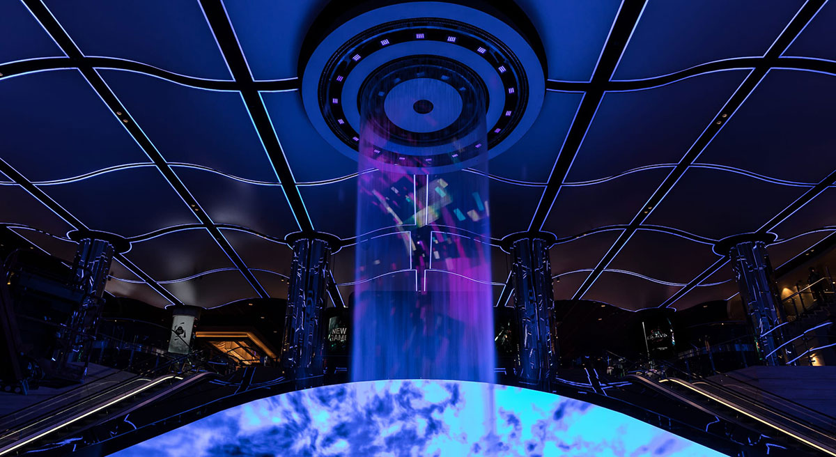 新月形数字画布前方有一个13米高的圆柱形、可编程的水瀑布艺术品,多种不同的形式图像通过这个艺术品,从空间中心向下流动,形成一个优美的动态光线、激光和投影画布。移动的光图像通过天花板、墙壁和空间的水元素向下流动,作为数字画布的整体延伸,将视觉内容从画布扩展到整个两层的门厅。