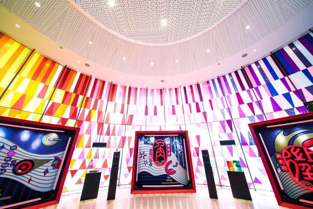 艺术展开幕当天,万花筒般绚烂的彩虹礼堂,四周是传统文化中五声音阶中五个不同音的名称的“宫商角徵羽”装置设计。