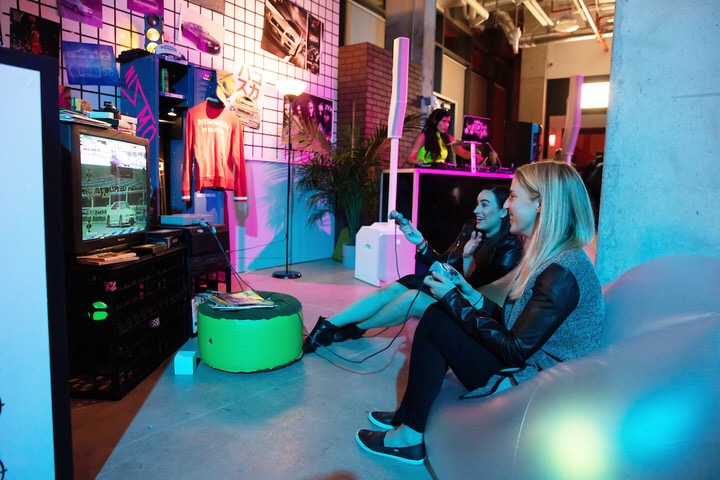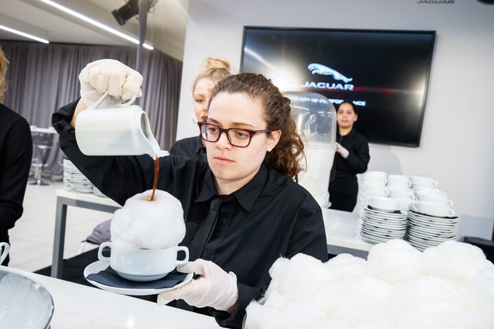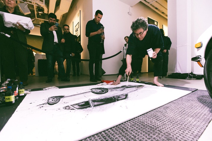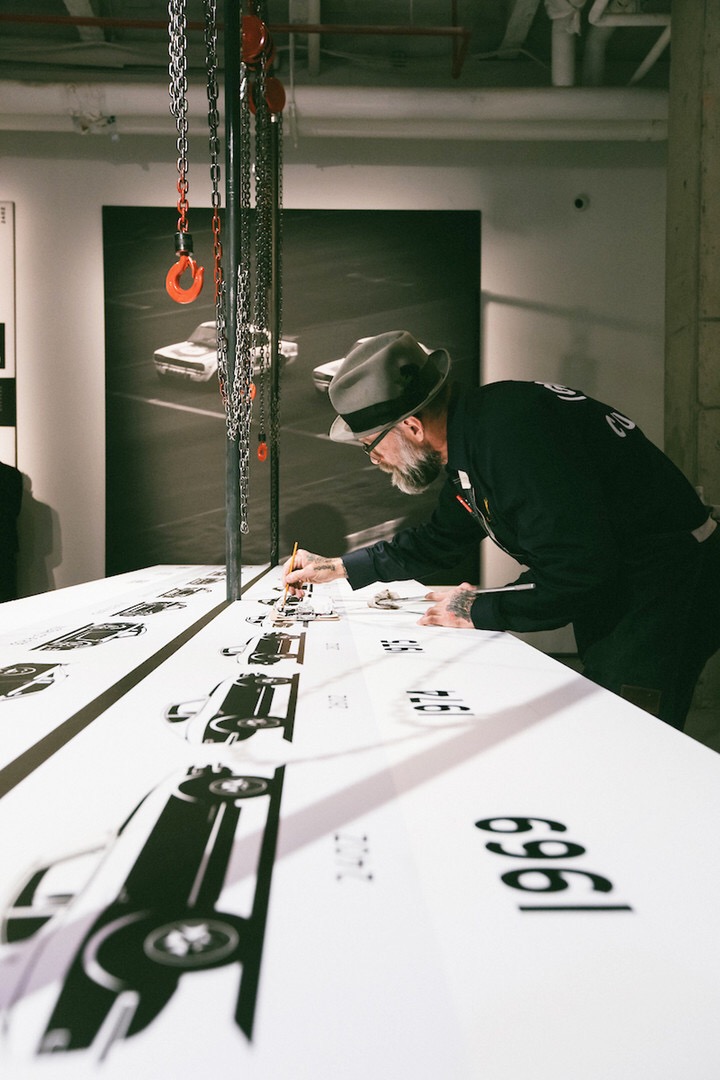 在丰田的车展招待会上,墨菲的装置艺术甚至成为了现场的亮点。展位策划设计搭建了三个装置,图中这个全白的装置上全部是户外装备包括:滑雪板,头盔,背包,和咖啡杯等,它体现了丰田品牌消费者的生活方式。