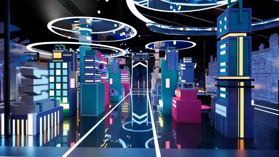 高科技的都市感,可能城市质感都是像素化的,城市的科技感更容易由块状或者数码形象表示出来,下图中的场景,更像是一种更具有想象力的空间,设计师一定很努力了。