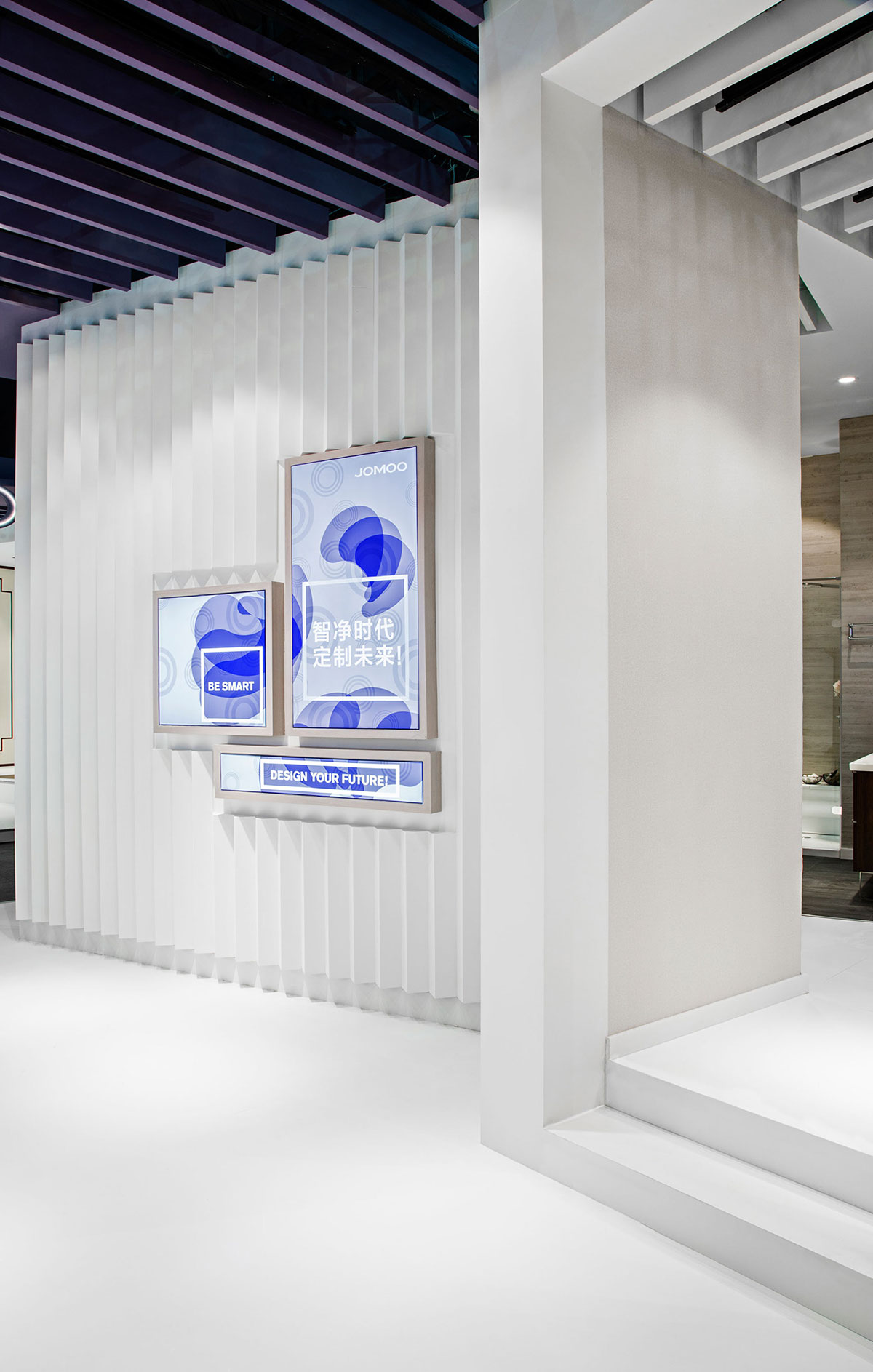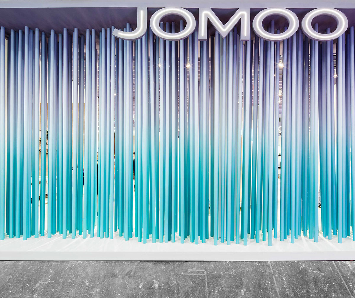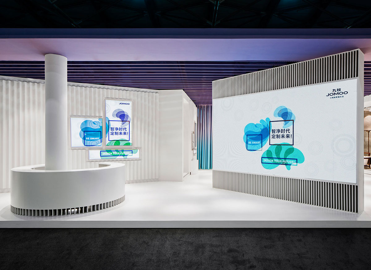 JOMOO九牧一家专注高端卫浴的企业,其自主研发生产卫生陶瓷、智能厨卫、整体卫浴、厨卫家具、五金龙头、厨卫五金、九牧晾品、九牧橱柜等产品。此次九牧的展位设计更像是一个艺术品,色彩简洁清亮,渐变色的蓝和紫给整个展位增色不少,提升了整个展位设计的格调。