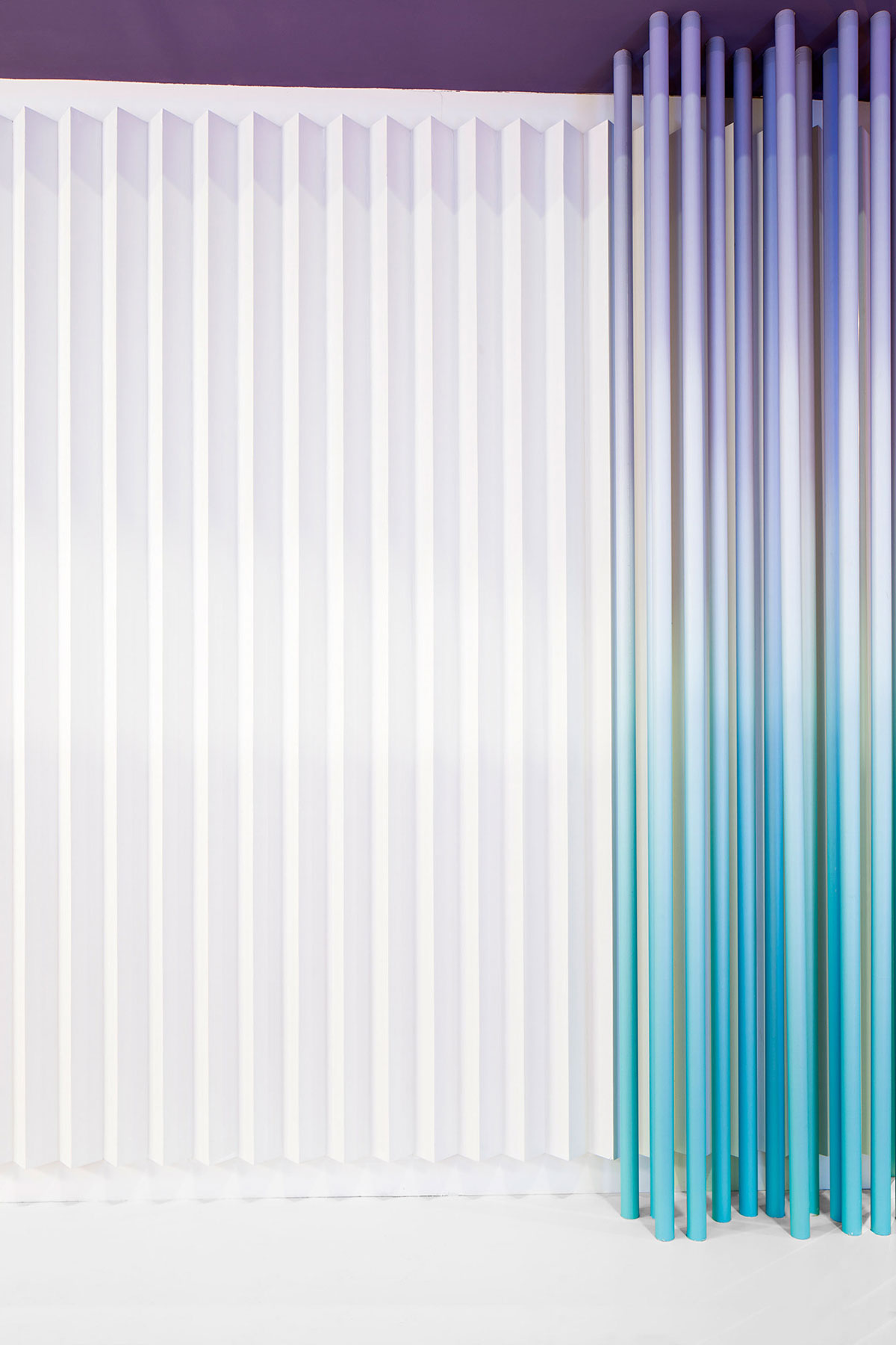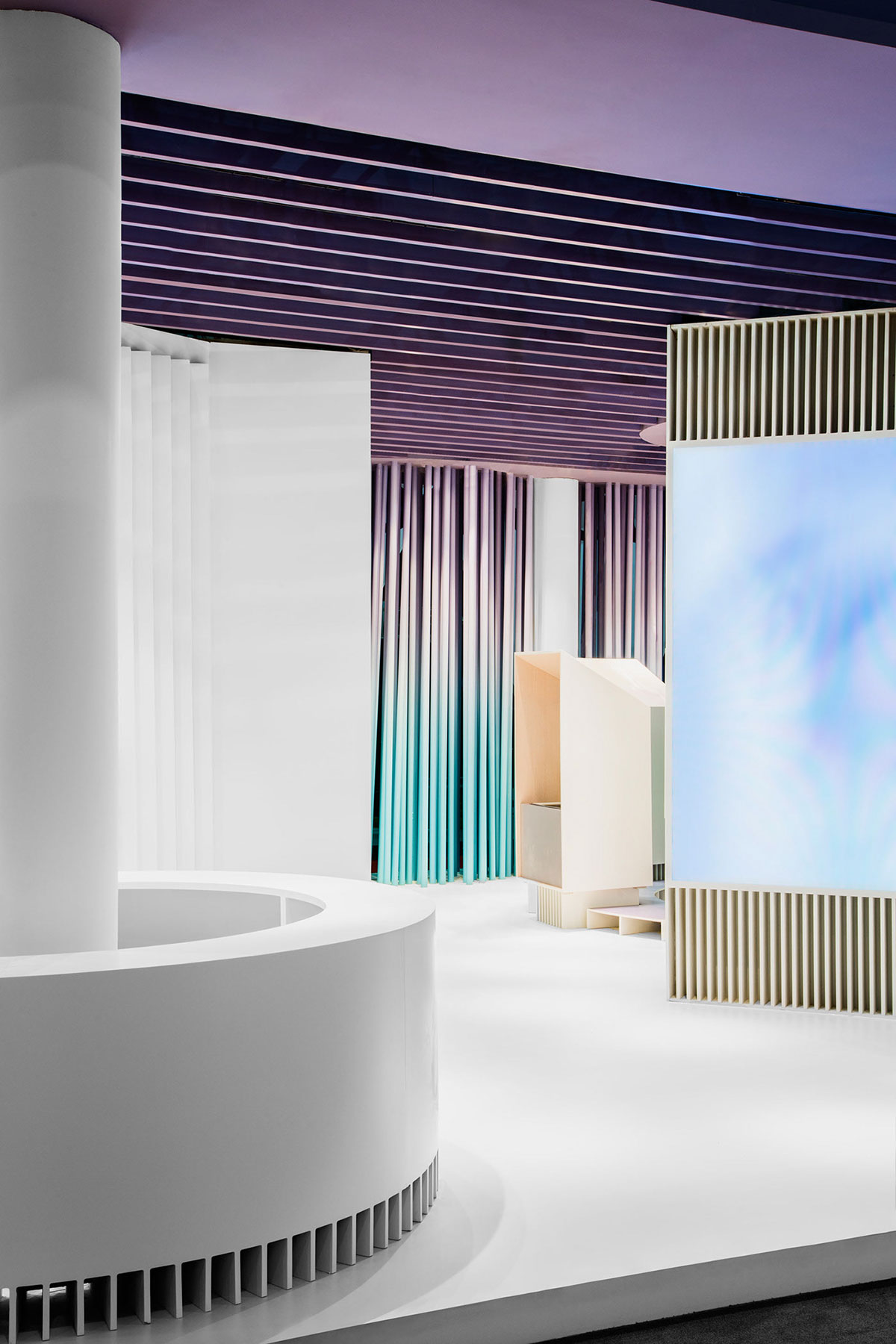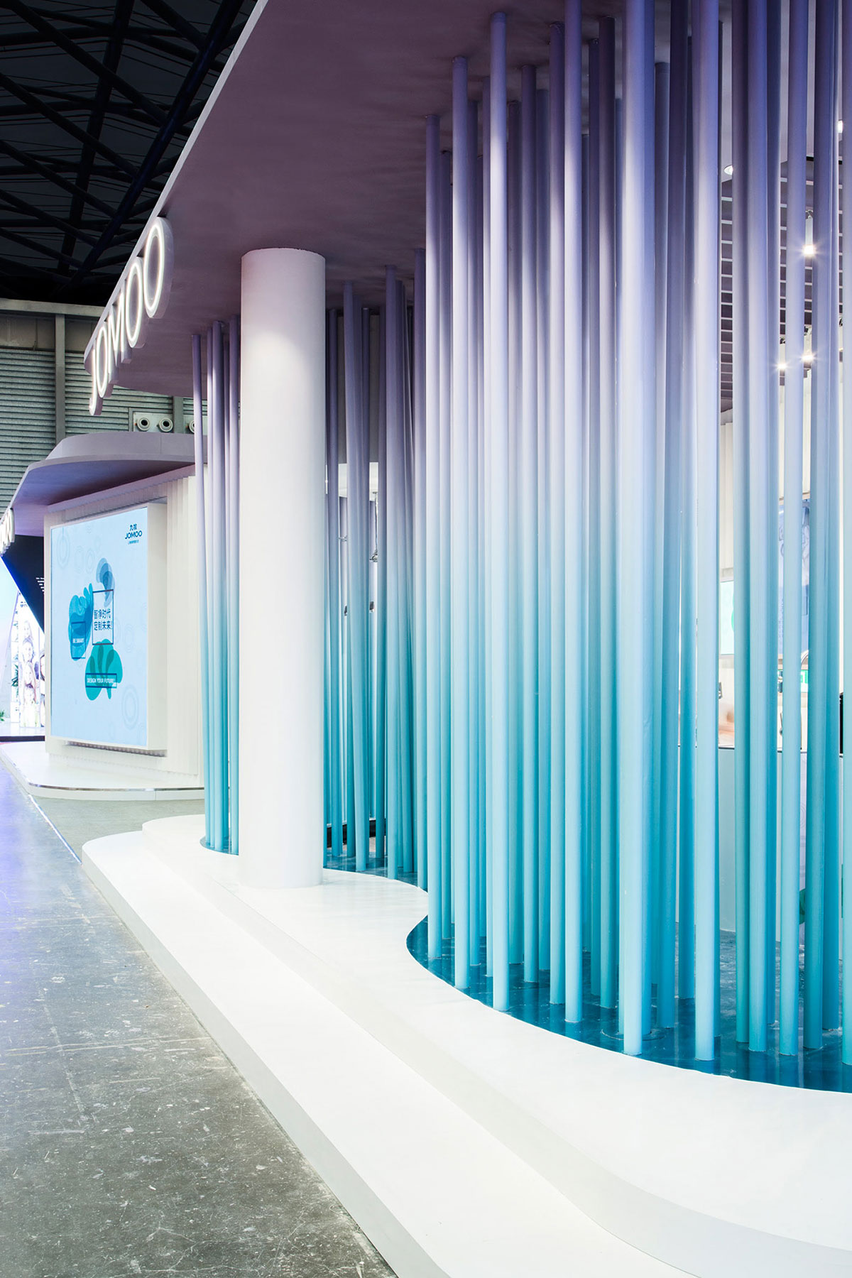 JOMOO九牧一家专注高端卫浴的企业,其自主研发生产卫生陶瓷、智能厨卫、整体卫浴、厨卫家具、五金龙头、厨卫五金、九牧晾品、九牧橱柜等产品。此次九牧的展位设计更像是一个艺术品,色彩简洁清亮,渐变色的蓝和紫给整个展位增色不少,提升了整个展位设计的格调。