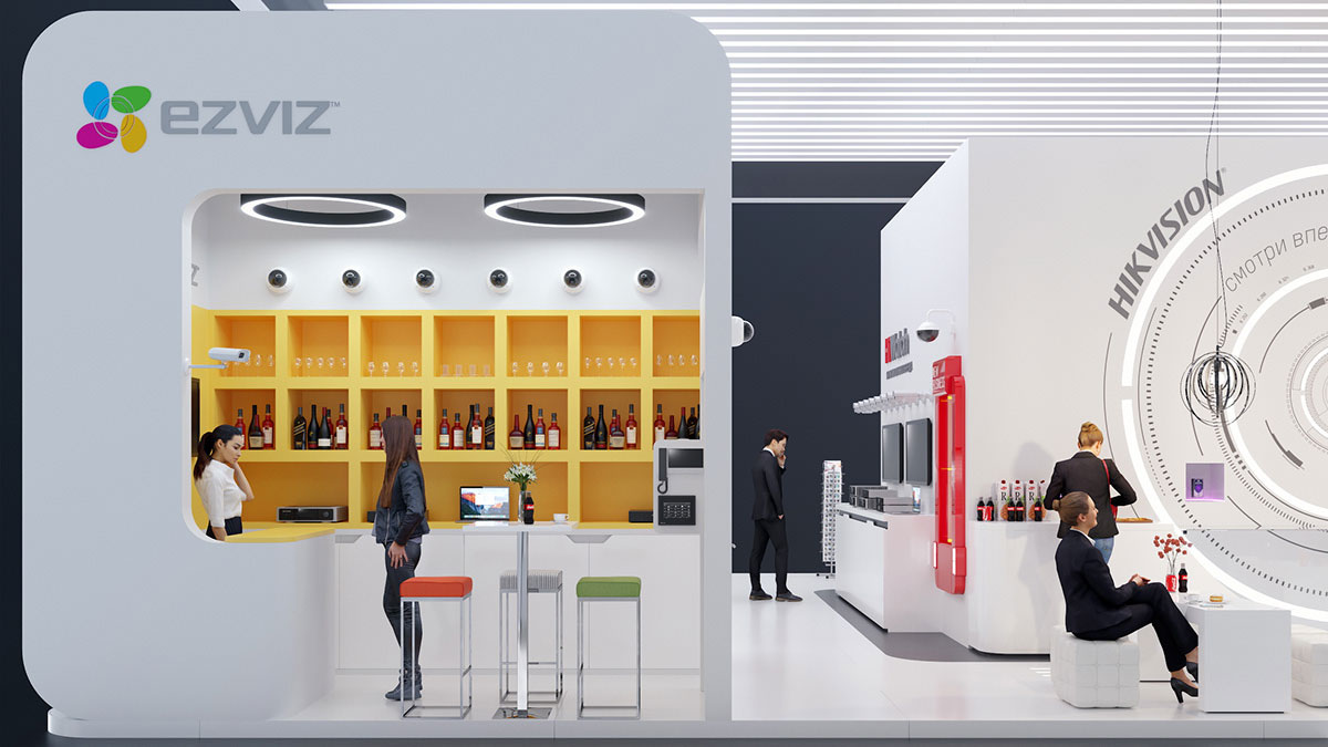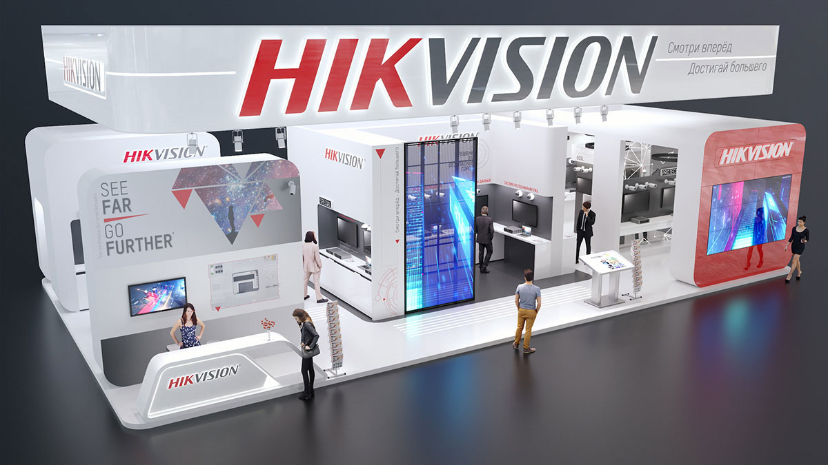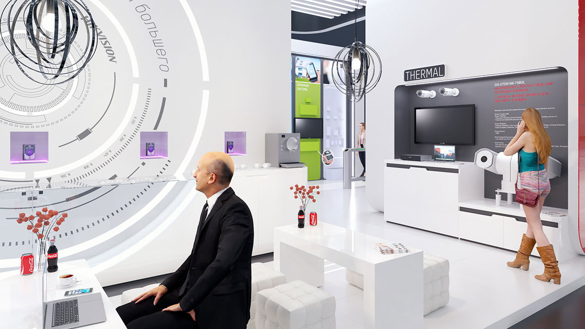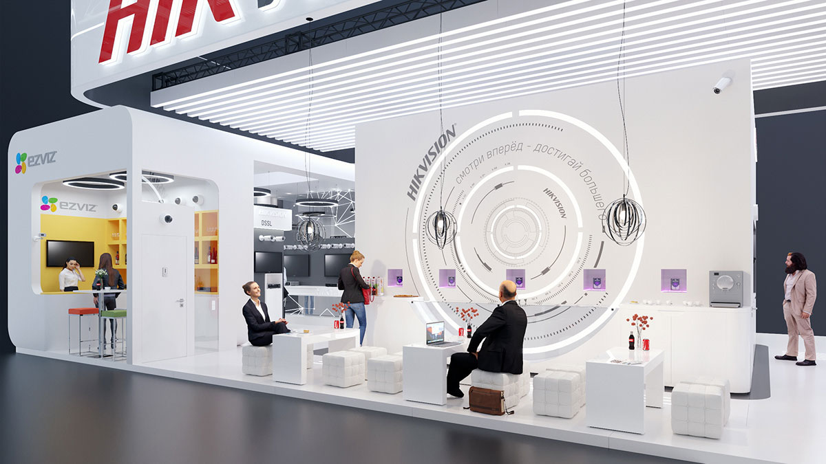 此次海康威视的国外展位设计整体以灰白色为主色调,加上零丁的红色作为整个展位的点缀,整体的功能分区也很明晰,现场更设置了展示屏轮回播放海康威视的相关品牌视频,提高了参展人群驻留了解。