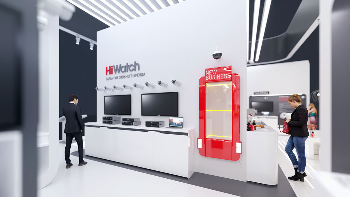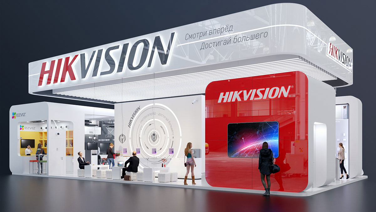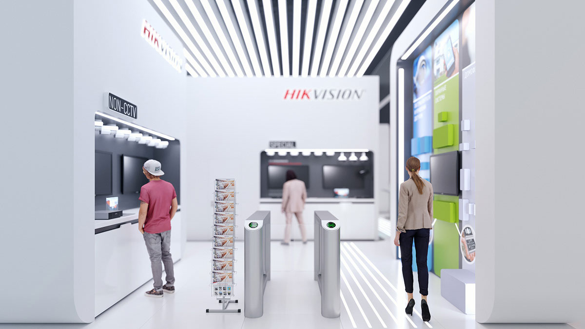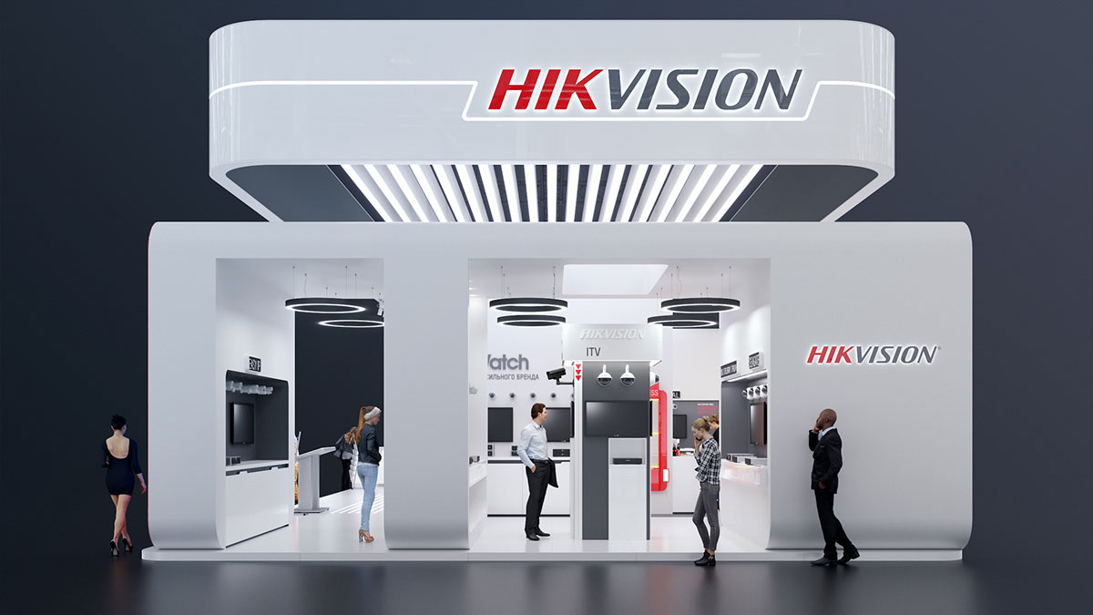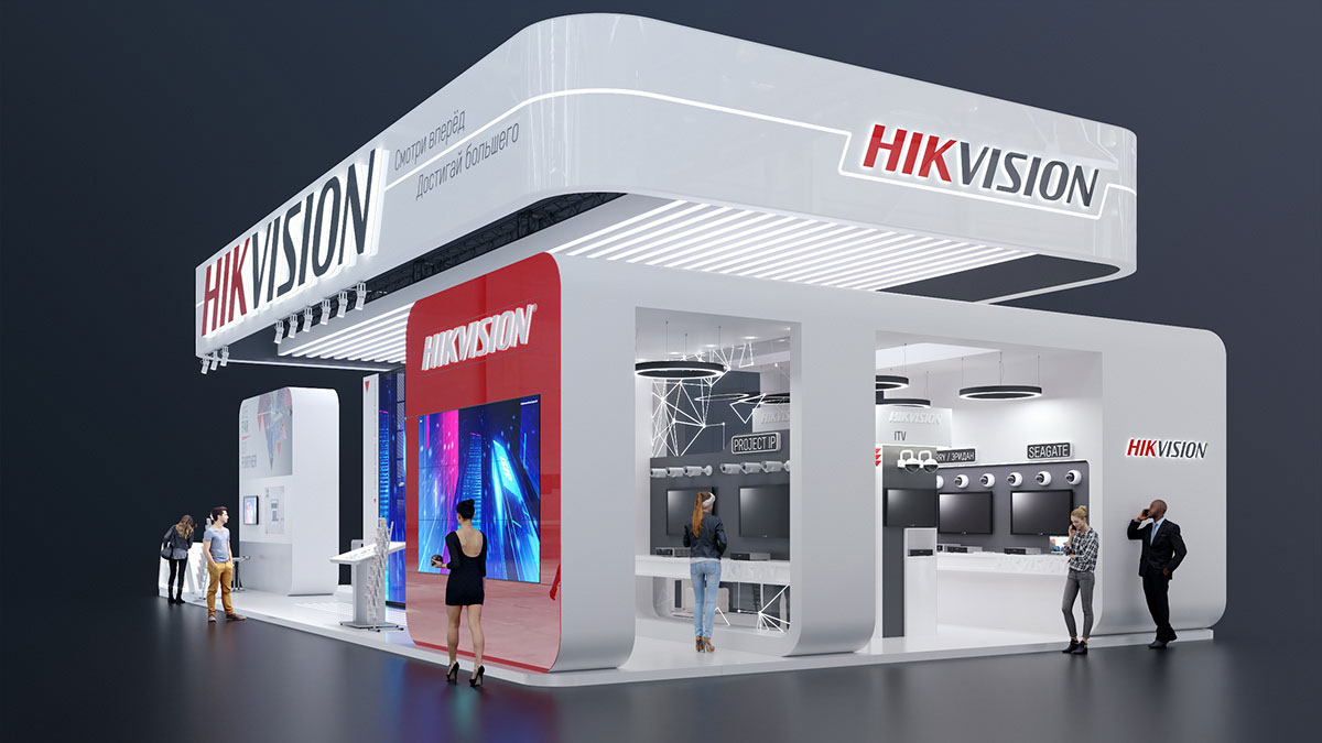 此次海康威视的国外展位设计整体以灰白色为主色调,加上零丁的红色作为整个展位的点缀,整体的功能分区也很明晰,现场更设置了展示屏轮回播放海康威视的相关品牌视频,提高了参展人群驻留了解。