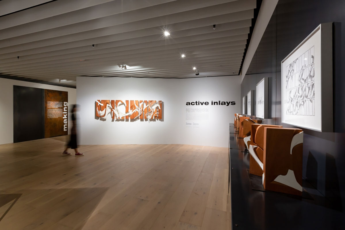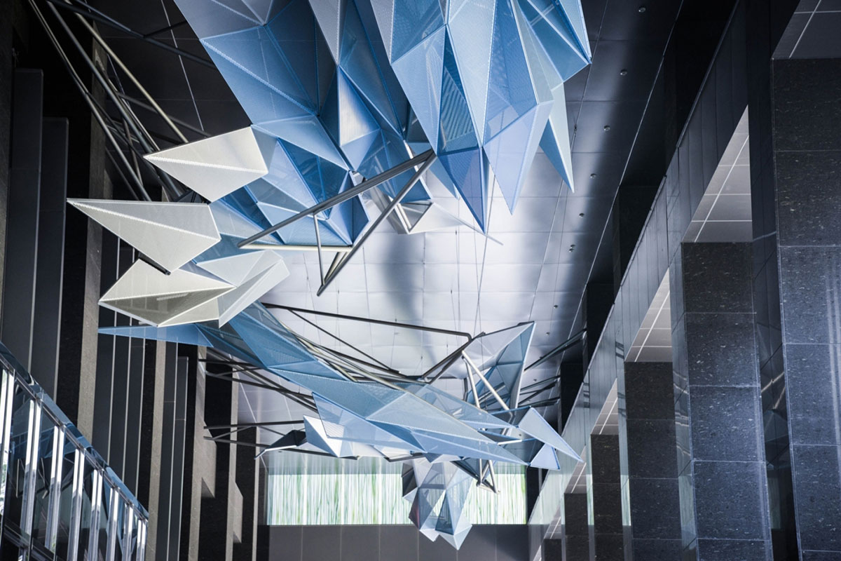 除了室内展览室外,忠泰美术馆园区的明日博室外走廊上方还有一幅最大的作品“琉璃云”。它长约45米,由355块相同尺寸的蓝色和白色金属三角形面板堆叠而成。