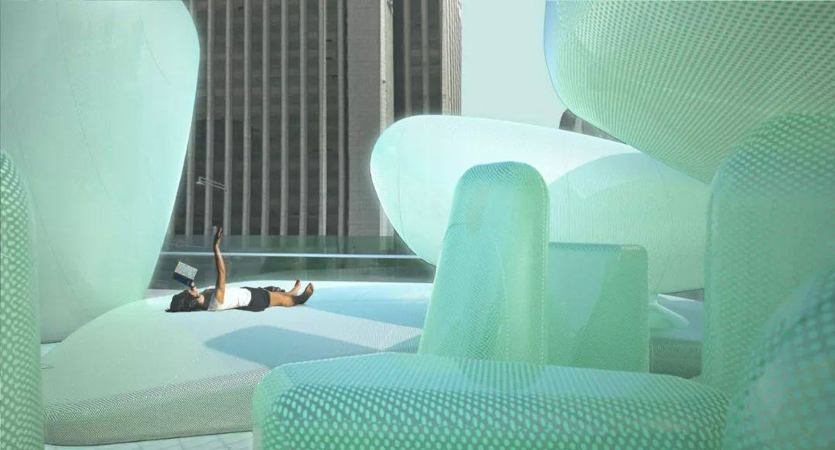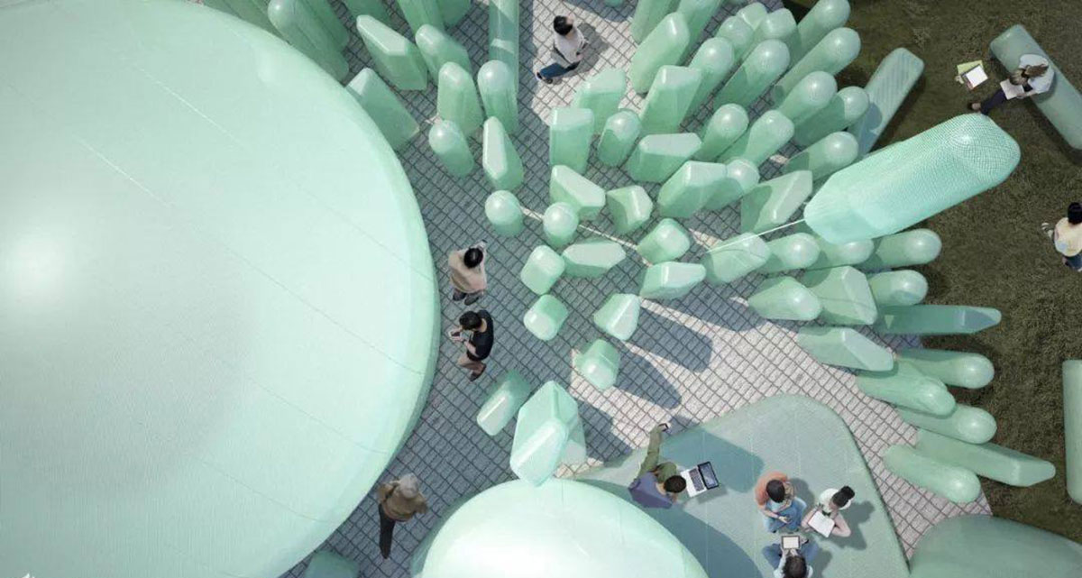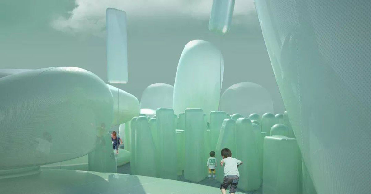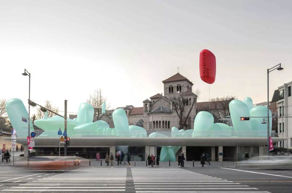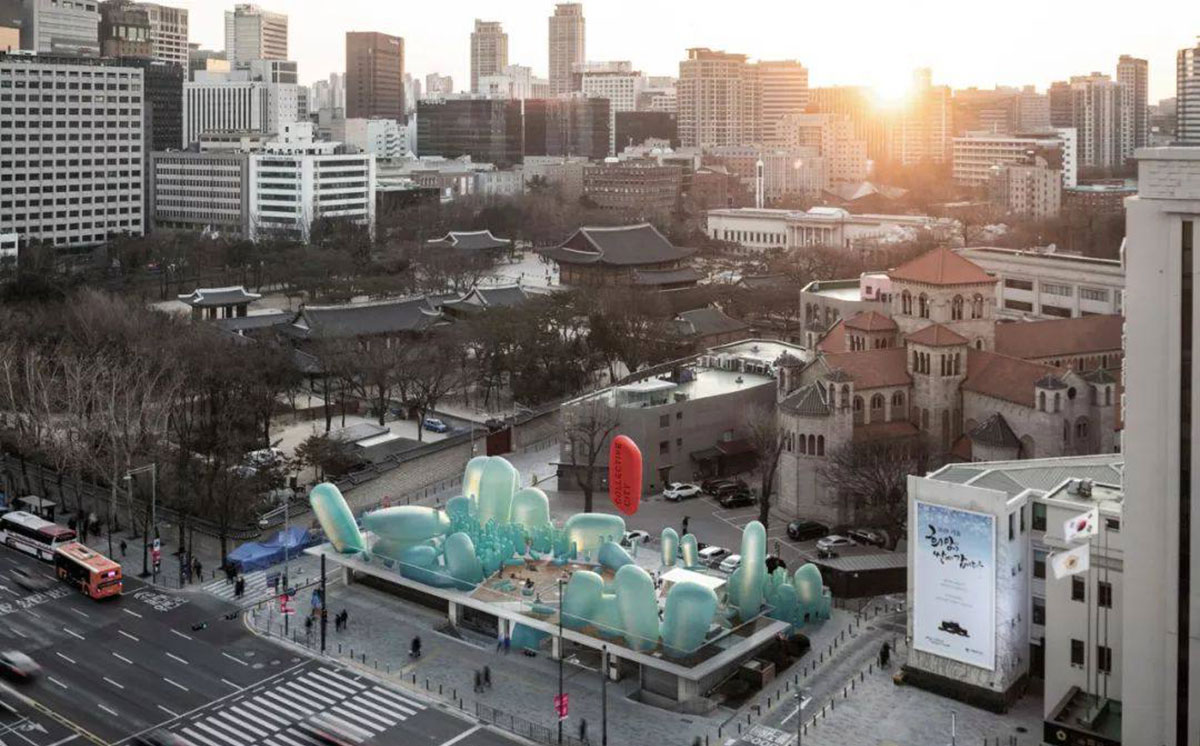 New Korean Garden是一个Ins风会议和活动空间,计划放置在韩国首尔的屋顶上,这是一个绿松石,鹅卵石般的充气设备。
