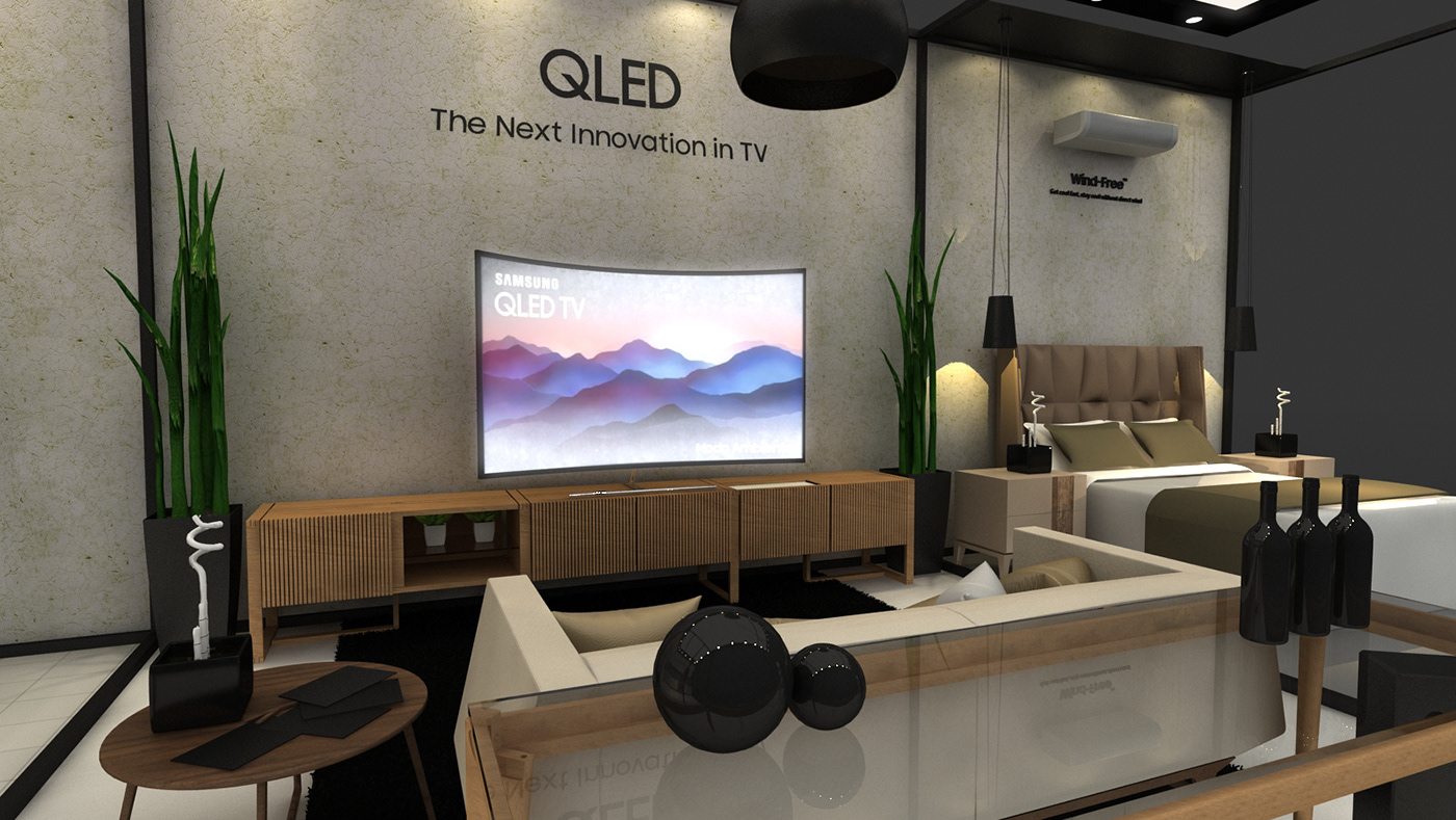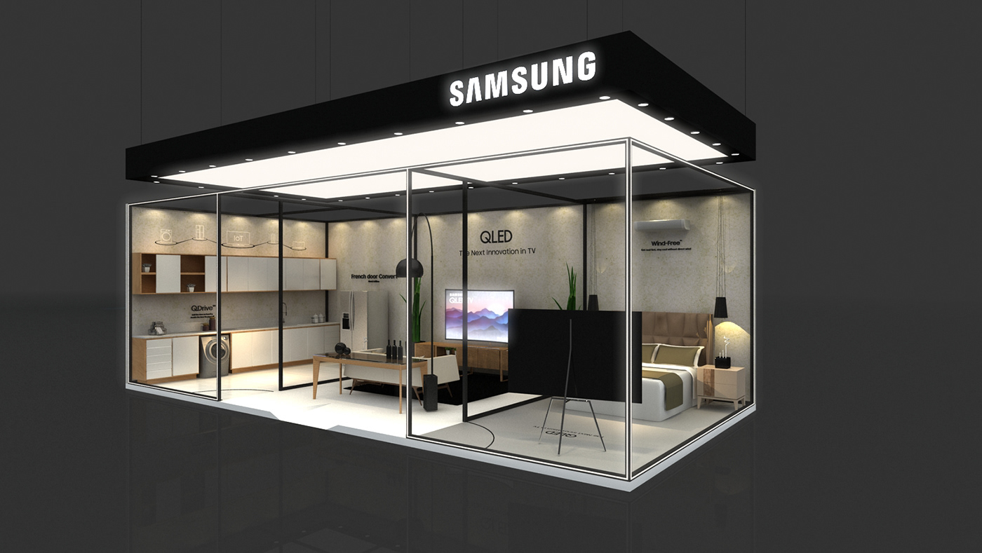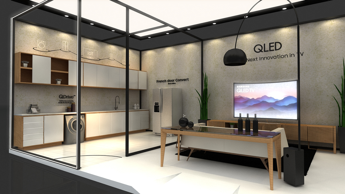 对于一个精英白领人士来说,理想的居住空间就是有一个小厨房,一个会客厅,再有一个舒适的休息空间即可。Samsung High Design Expo 2018展位设计一看就是为精英白领人士们打造的宜生活居住休息的空间嘛。以中间的会客厅作为分界点,两边分别是厨卫空间和卧室,欧式风格的装饰,功能分明的分区,性冷淡的中式色调和装潢,落地窗的设计,满足了精英白领人士对高生活品质的追求,简约、高端而不失华丽。