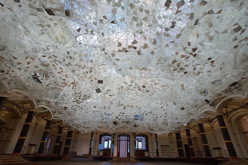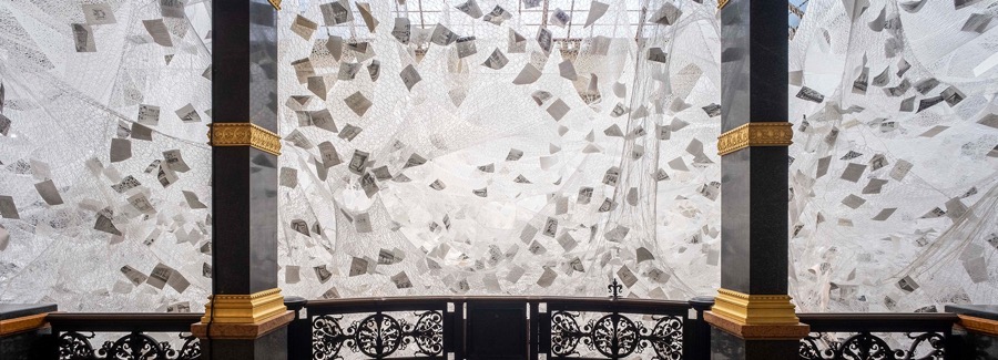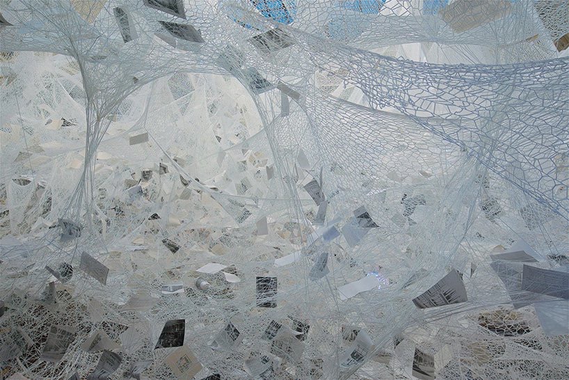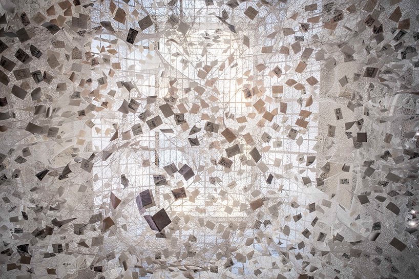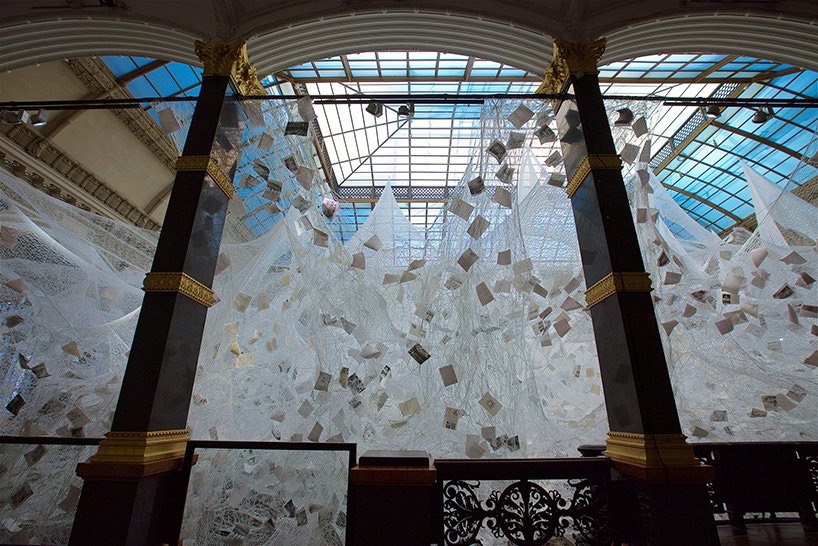 而此次展出,参观者可以从地面向上仰望或者从上层阳台向外看去两种不同的角度观看,通过无数的白色纱线、纸质票据、黑白照片、传单以及撕下的书页等,深切的感受盐田千春所要传达的轮回的概念。