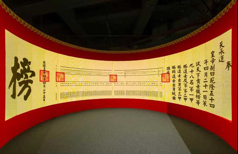 主要展示严格考证复原的“清乾隆五十四年大金榜”,并用交互形式引领观众进行体验。展览根据第一历史档案馆所藏“光绪三十年大金榜”制式,通过对字体、纸张、印章及格式等方面的研究,并查阅“乾隆五十四年进士提名录”进行复原。