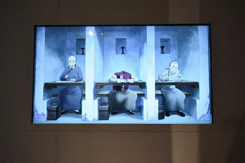 序厅主要以动画的形式交代整个展览的故事背景,是整条故事线的起点。观众在这里通过观看三段动画短片分别了解三位主人公的形象、性格和人生遭遇,建立直观而立体的人物形象,通过共情的方式了解特定时代和特定背景下的考生求学、赴考、人生方向选择的心路历程。