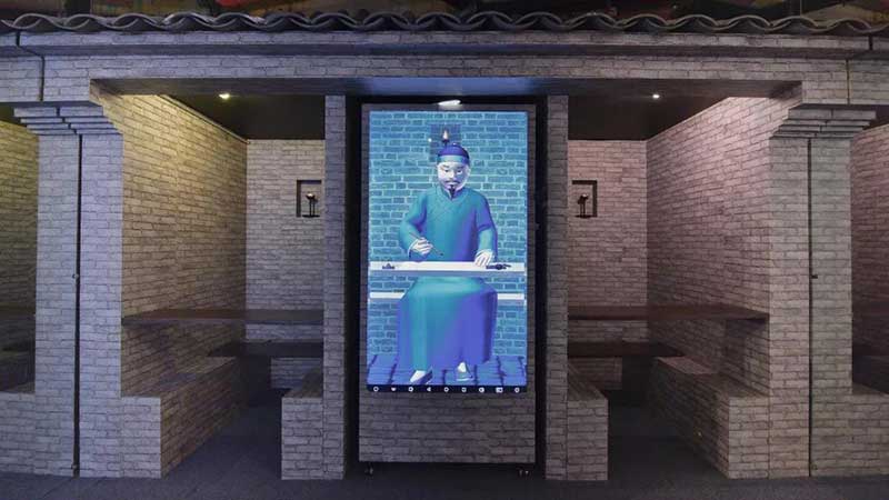 号舍考试:在一比一复制还原的江南贡院号舍实景中安放互动屏幕,运用人脸识别系统,根据史料运用三维动画将史料中二维影像以三维技术呈现,并通过识别脸部240个点位实现虚拟形象与观众脸部微表情的同步。