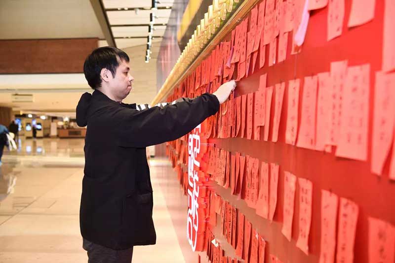 现场备有荣宝斋订制手工抄造红色洒金宣纸万年红、墨笔、泥金印泥,以及篆刻大家特为本展创作的“金榜题名”朱文印章两枚。在此可书写心愿,钤盖印章,用“金榜题名”特制贴纸把祁愿签贴于展览外场红墙之上。满墙万年红,满是满满祝福。