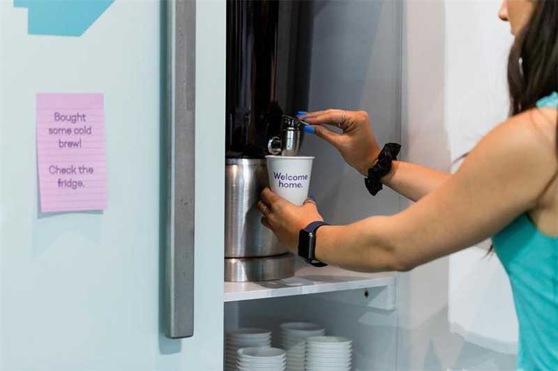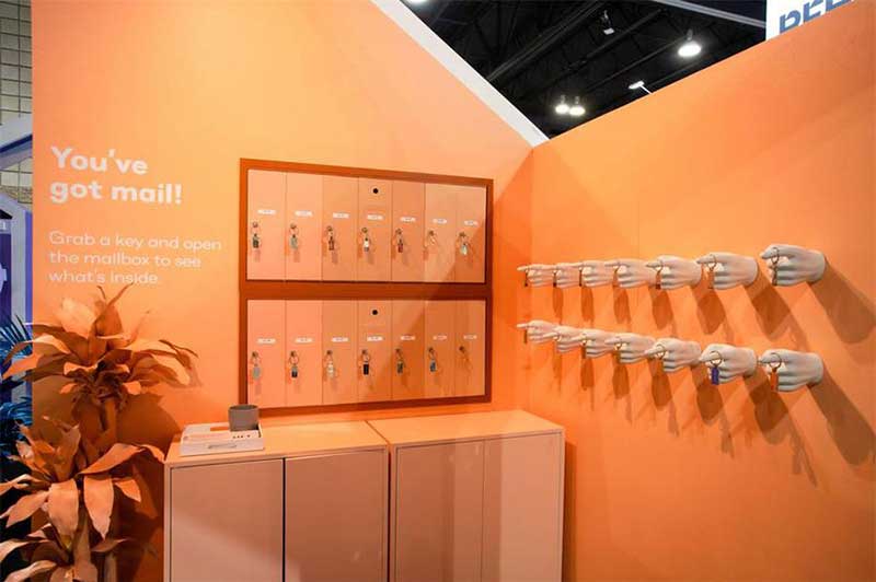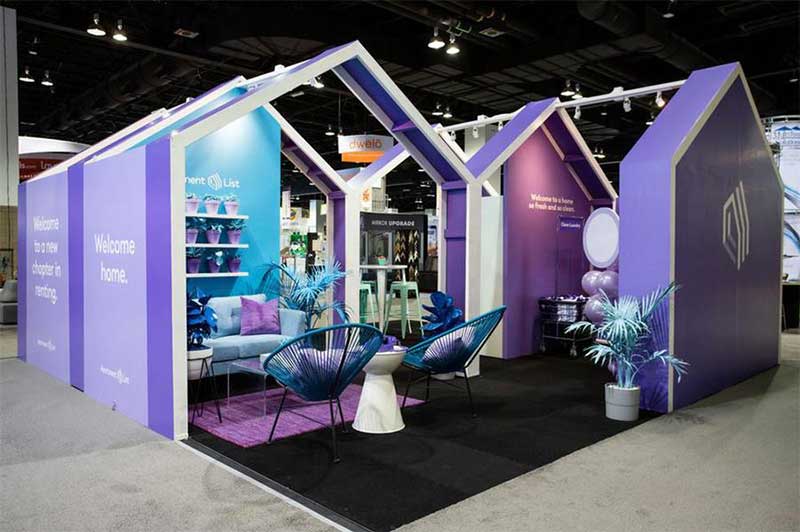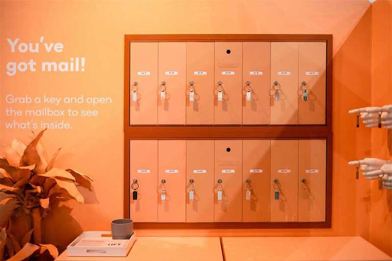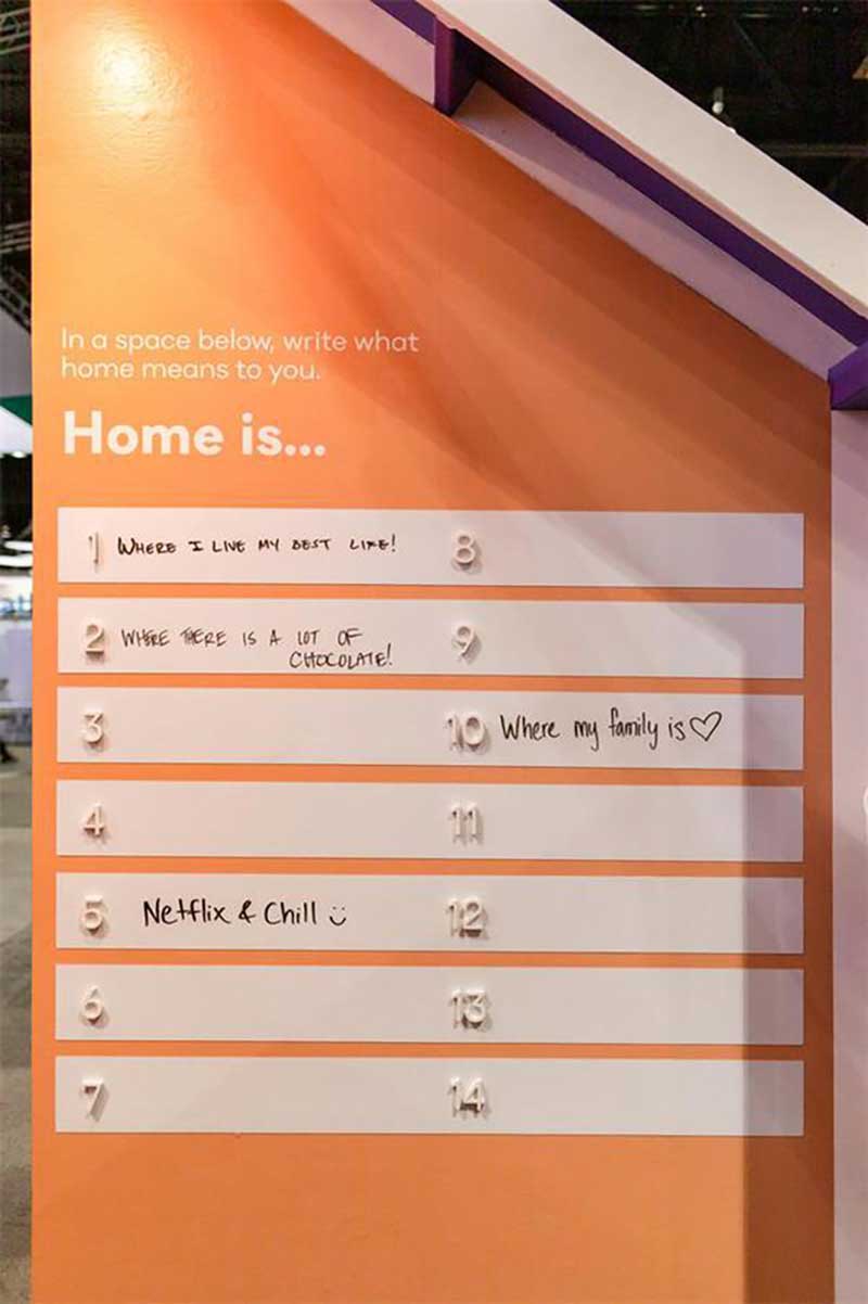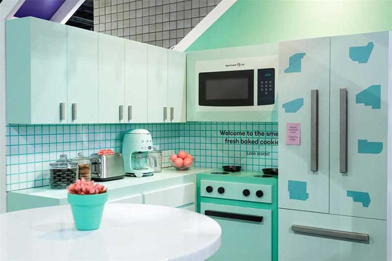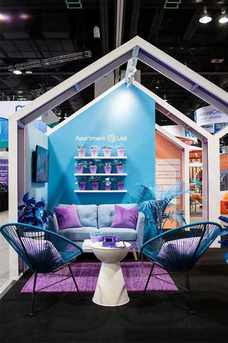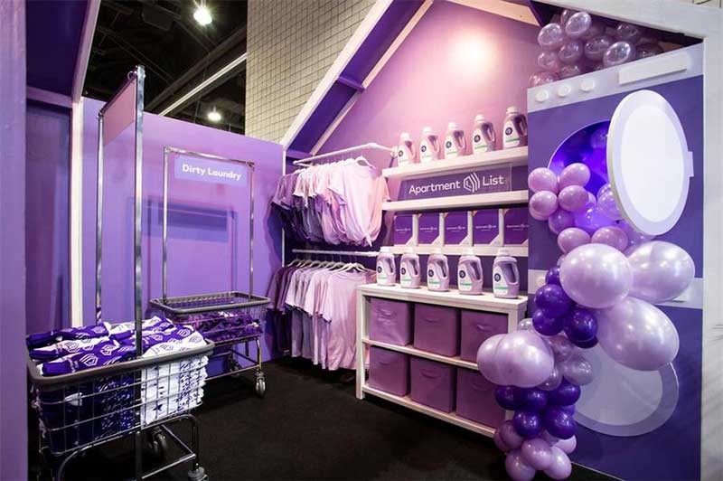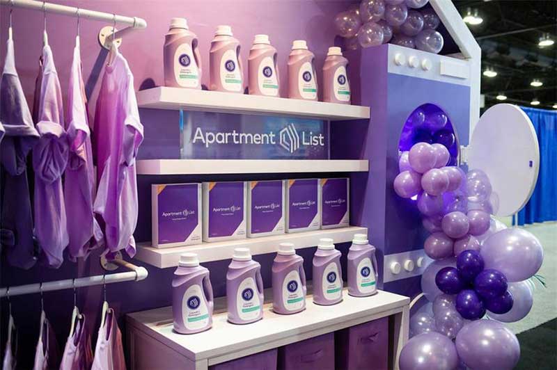 当你把房子当成家的时候,很多朋友都会出现……至少当你把一个“家”放在会议中心的时候是这样的。在今年的NAA(全美公寓协会)大会上,Apartment List的展位以房子形状呈现,这个房子形状的logo就是在NAA大会上诞生的,活动现场请求与会者拍一些可以发到instagram上的照片。首先迎接客人的是一个创意的“邮件收发室”,客人们可以取下前面上的手指上挂着的钥匙,打开邮箱里面是赠送的礼物。然后可以进入“厨房”和“客厅”里走一走,参观剩下的家庭空间,最后进入紫色的梦幻“洗衣房”,实现一个完全体验式的展览。