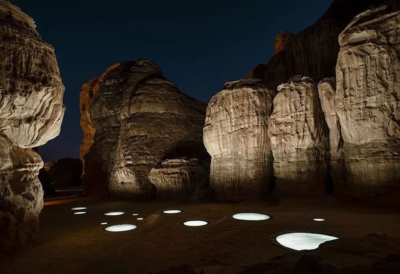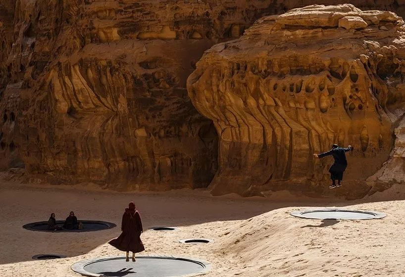 艺术家manal aldowayan — “now you see me, now you don’t”:这个装置说明了沙漠中暂时的水坑。水坑是偶然形成的,它可以代表并承载大量的信息和思想,但也可以在任何特定的时刻消失。它的结构就像地面上的蹦床,游客可以看到它在水坑里蹦蹦跳跳。晚上,阳光从下面照进来,重新激活了水坑。
