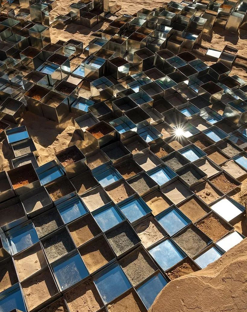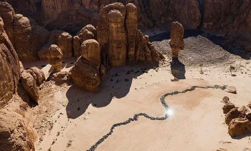 这个大型沙漠装置响应了具有重要历史意义的绿洲的景观和特定条件。阿鲁拉的沙谷被高耸的砂岩峭壁所环绕,数千年来一直是连接亚洲、非洲和欧洲的熏香贸易的跨文化路线。景观包含了自然和人类的作品,表达了环境和文明之间的长期共生关系,建立了文化路线。