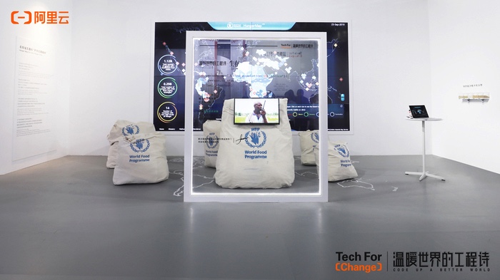 实体的 WFP 粮食袋被搬入展区,分布标注粮食短缺的世界地图之上,正如他们会在现实中,空投到饥荒地区那样。中央大粮食袋上,嵌入了电子屏幕,循环播放 WFP 的直升机精准投送粮食袋的真实影像。