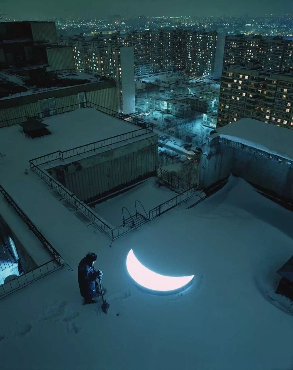 俄罗斯摄影师、装置和行为艺术家 Leonid Tishkov总是将一弯月牙形的灯带在身边。