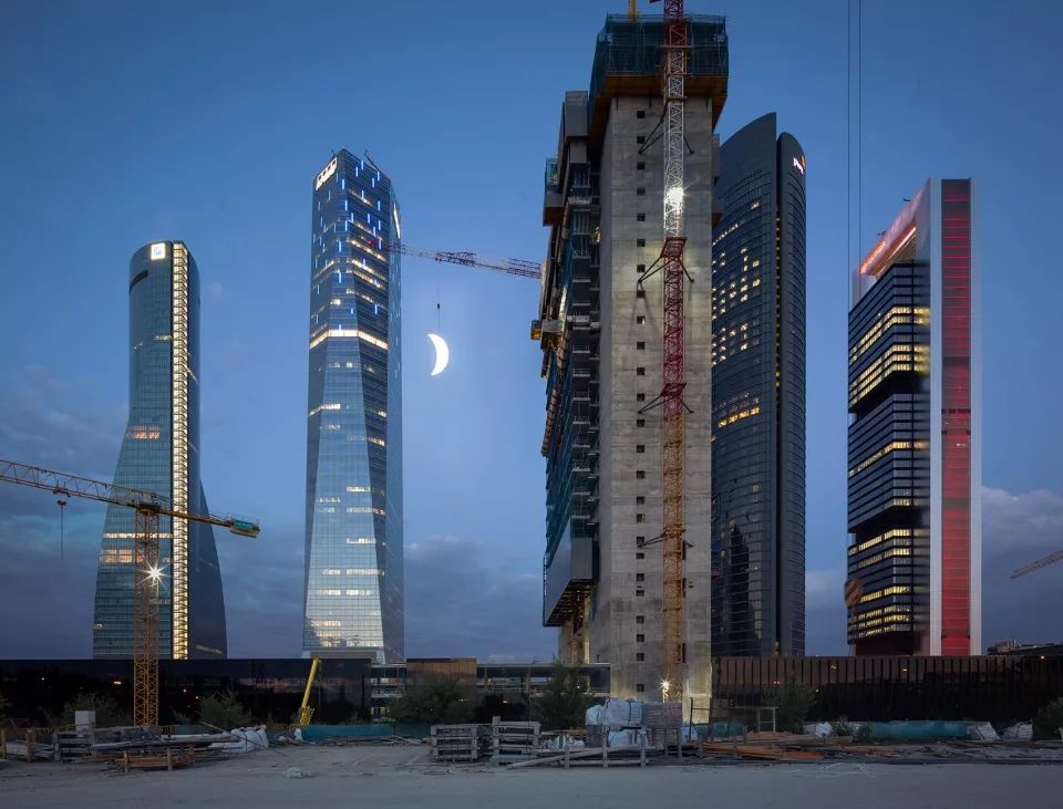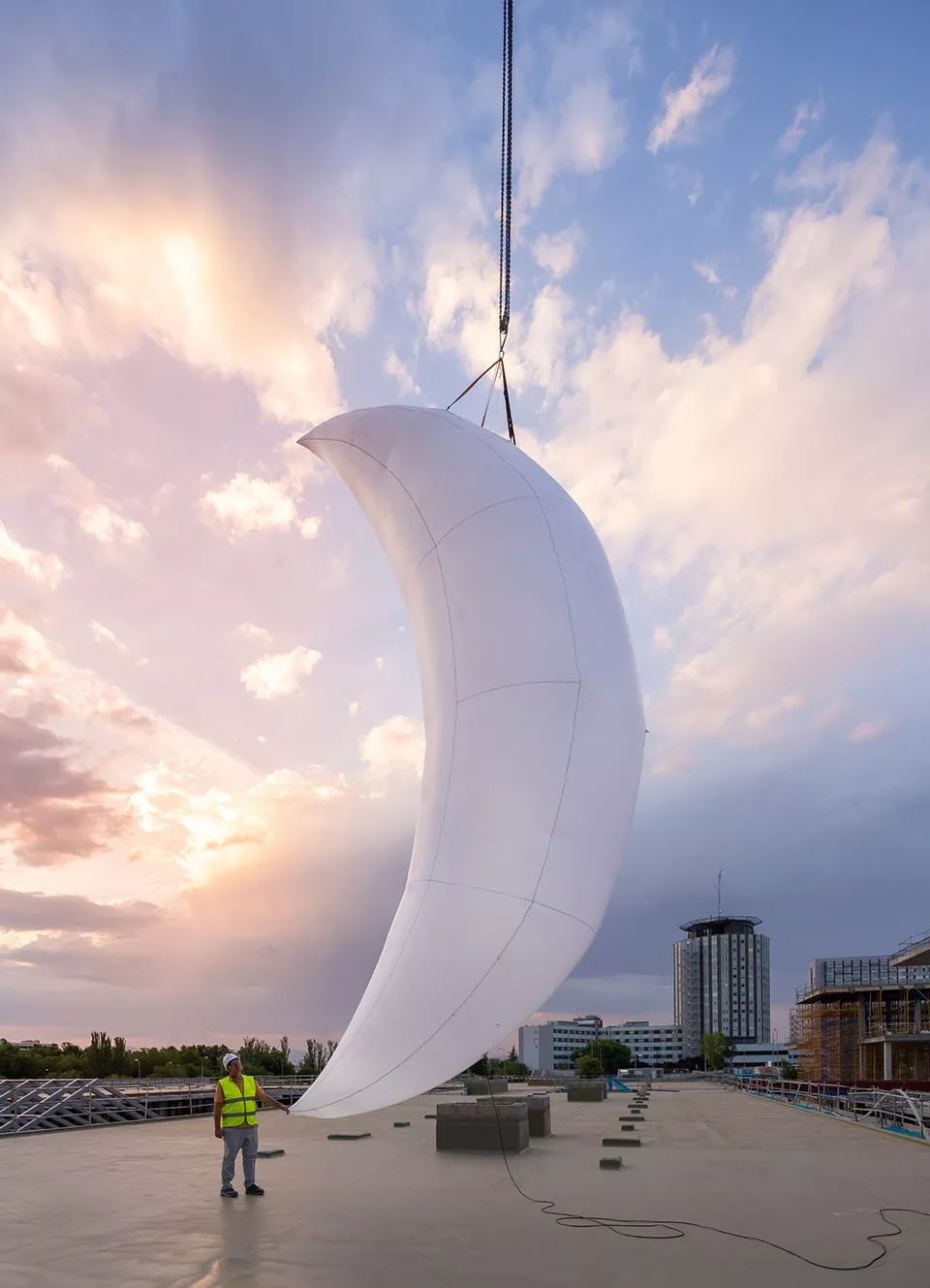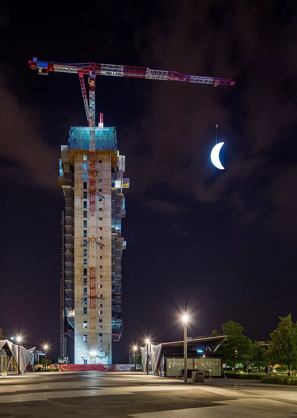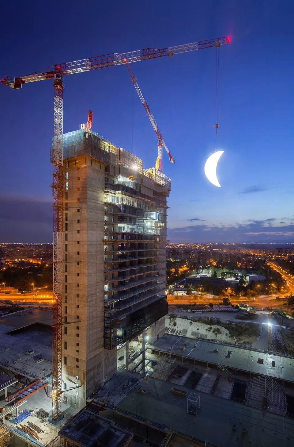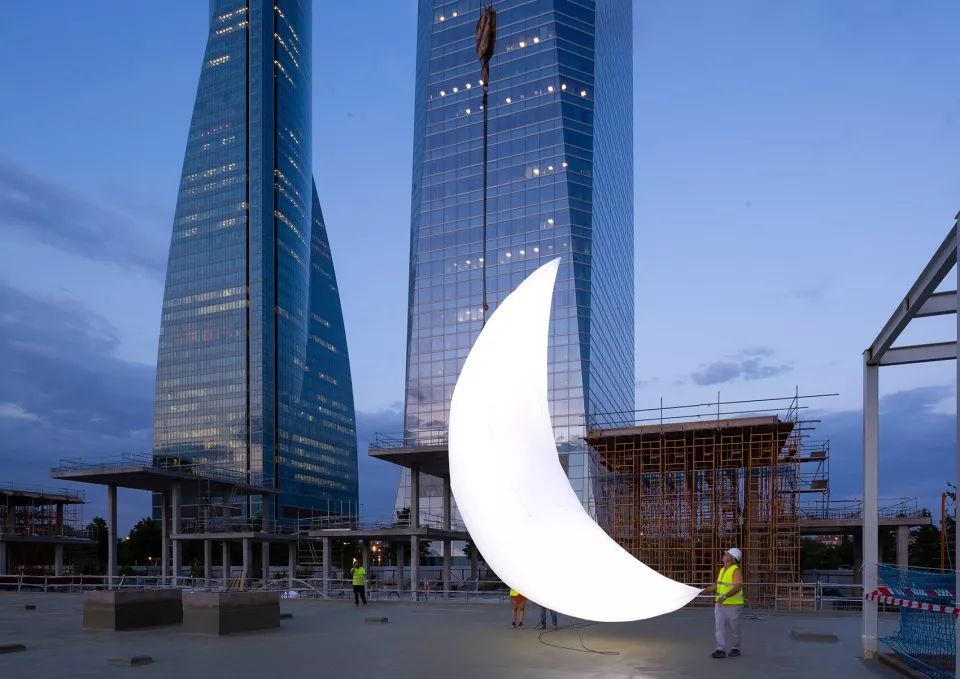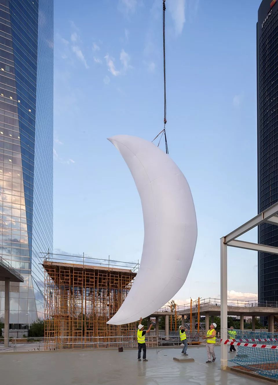 SpY 因其在马德里Mayor广场上的作品“Cesped”而闻名。如今,SpY凭借庆祝人类登月50周年的作品再次为公众带来了新惊喜。作品的构思简单直接:在北部马德里Caleido综合体的第五塔楼上,将一个上弦月复制品装置悬挂在起重机上。