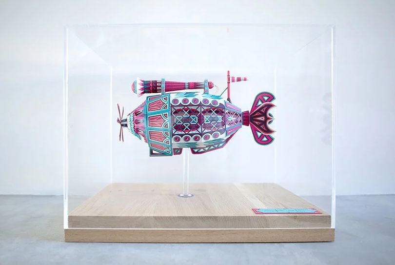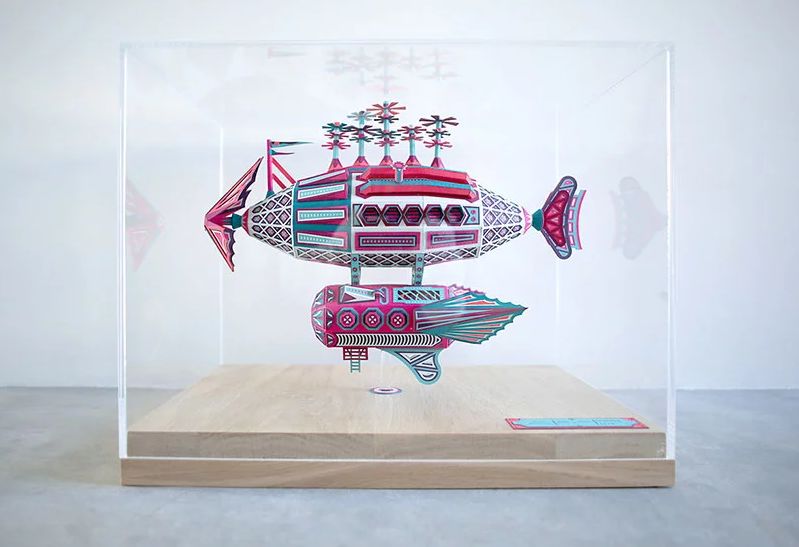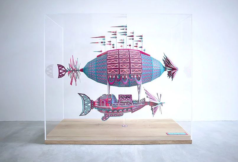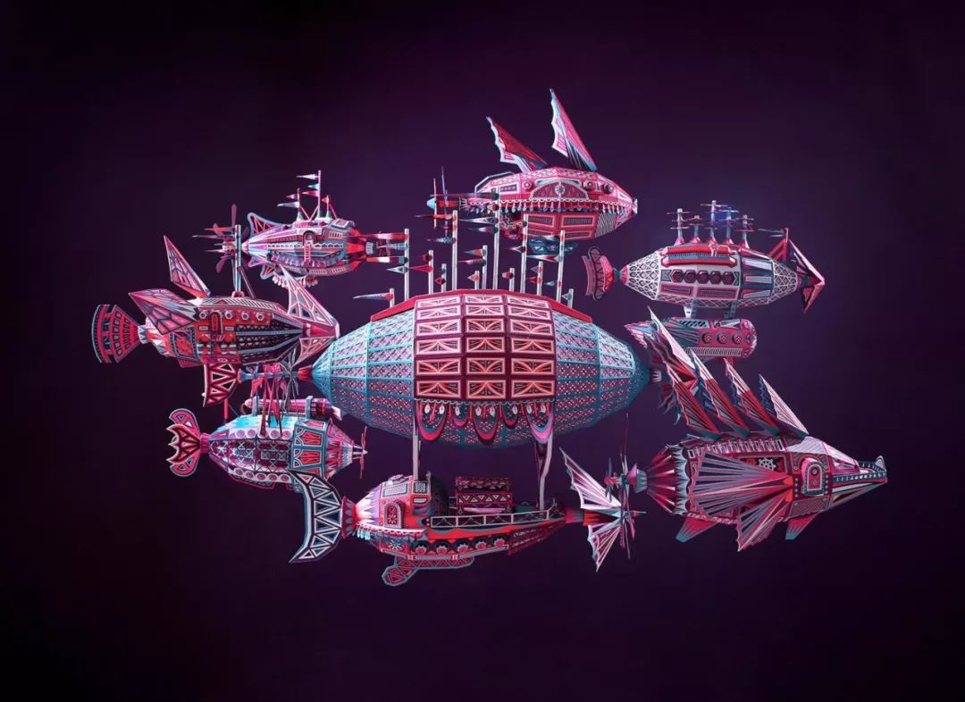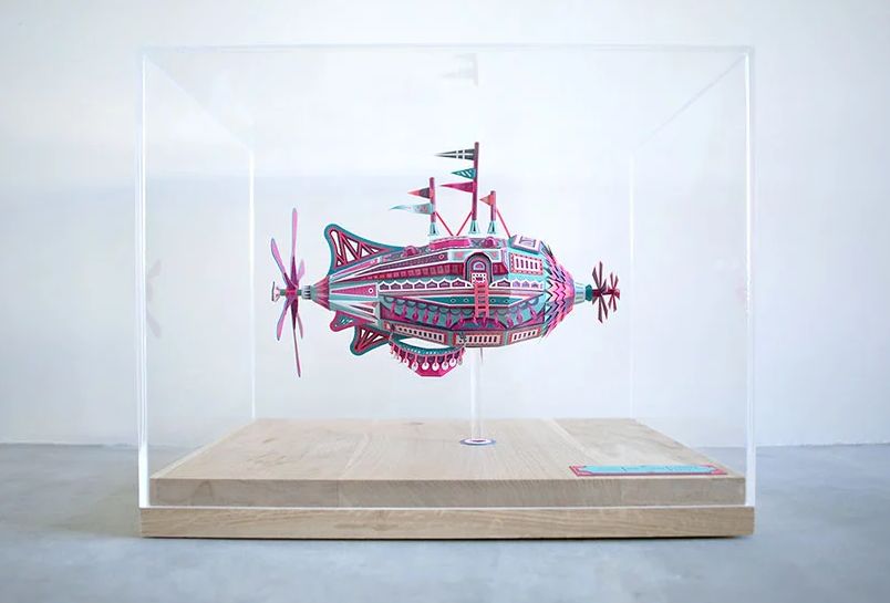 作品的所有细节也都是经过仔细的剪裁,细致的粘贴堆叠组合成飞船的几何图案及分层的螺旋桨到挥舞的旗帜等。驶向未知世界的飞船舰队,就像鸟儿在迁徙中追求另一个地方的梦想。