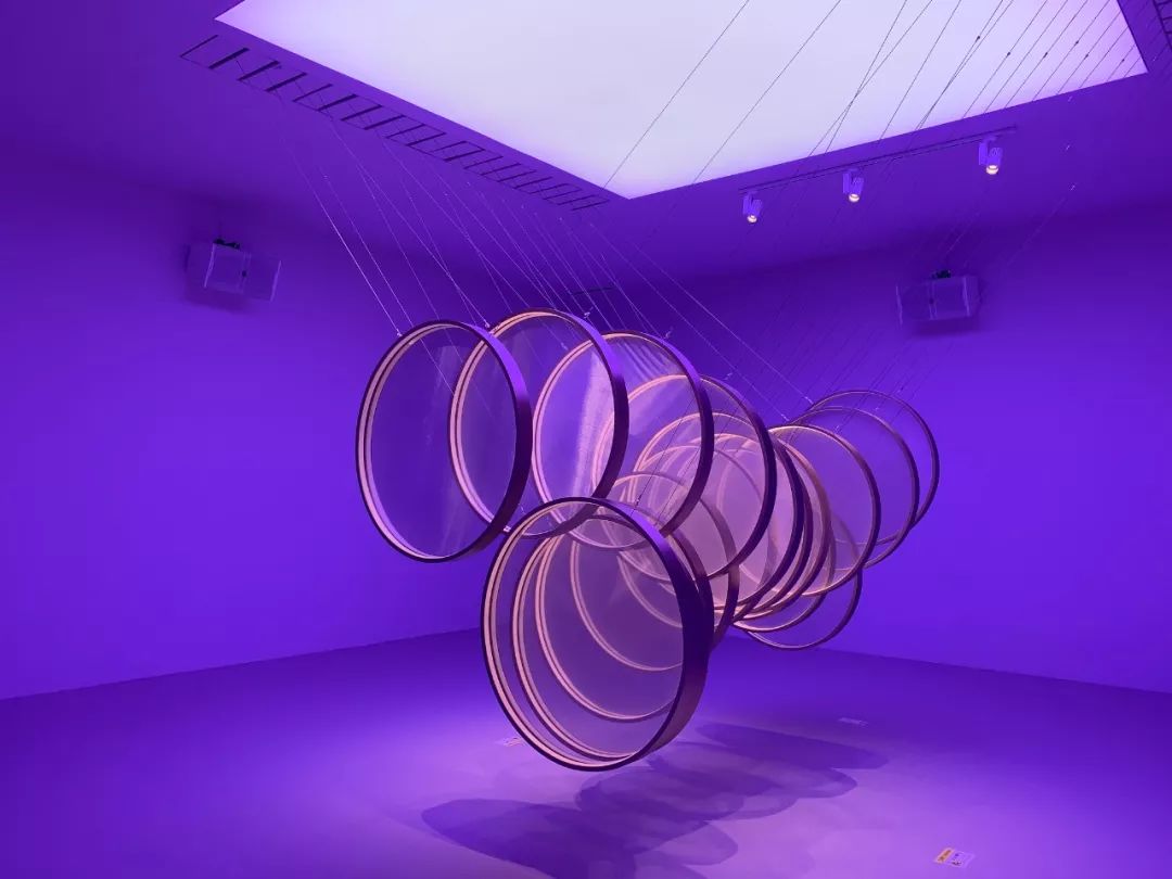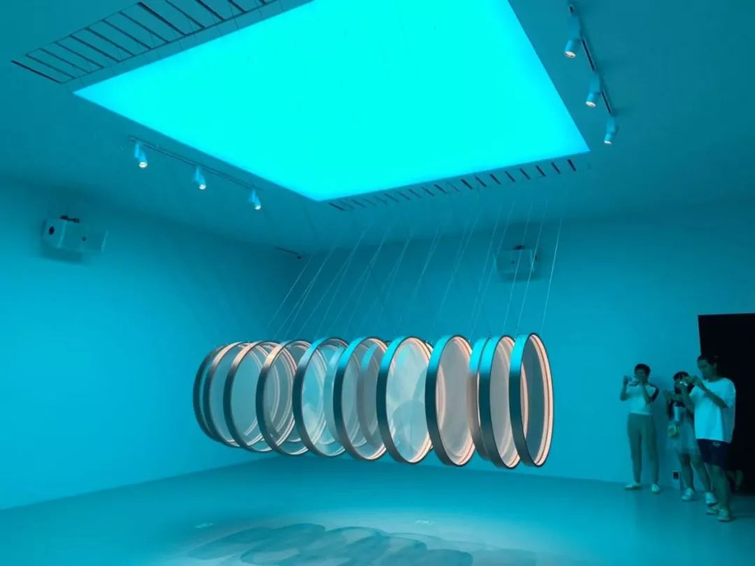圆形的矩阵机械根据程序的设定,在既定时间内,呈现空间和色彩的变幻.虽说大多数人逛展喜欢拍拍拍,但是现场有更多的人愿意放下手机,去体验这个装置所带来的规律与生机,感受纯粹和静谧的空间。