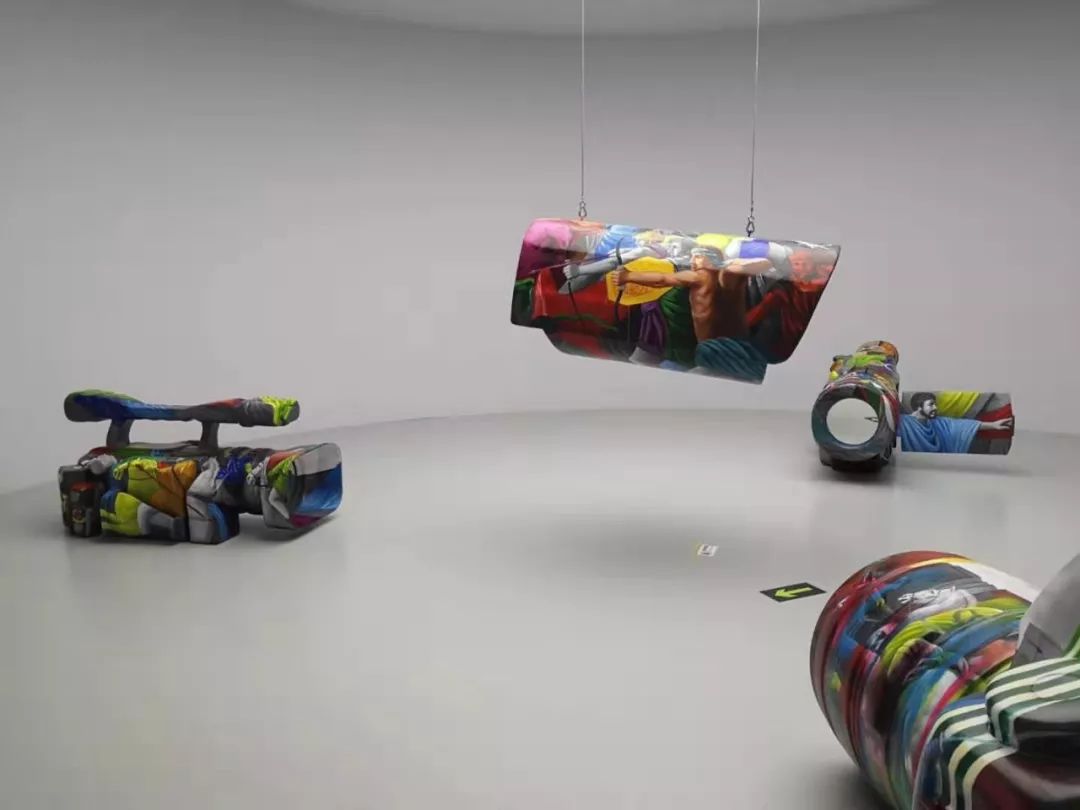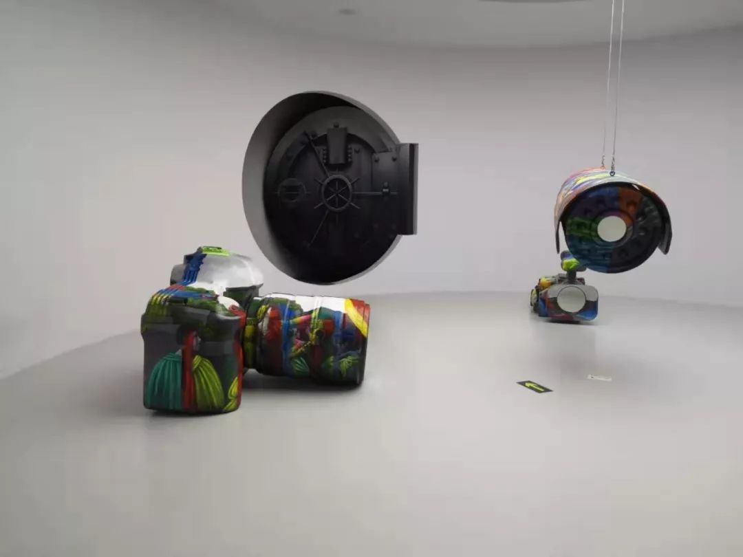偌大的灰色空间里只摆放了几个被放大拍摄装置,无论你站在哪里都会被它们“拍到”,暗喻了我们现在的生活被摄像机,照相机,手机所记录,限制在不断放大。隐秘的珍贵感与记录工具的使用仿佛化作一把双刃剑,被记录的同时被传播。