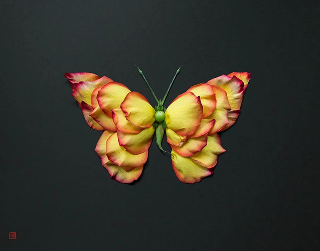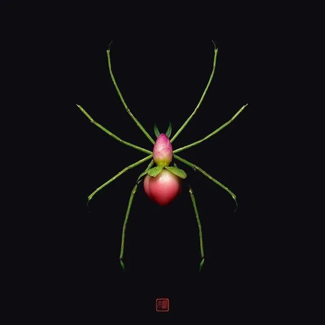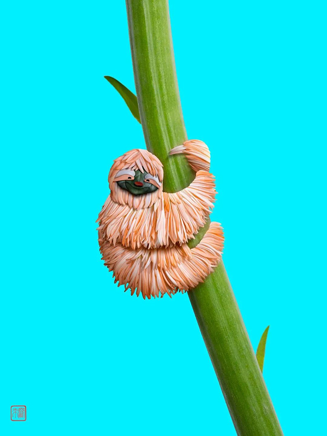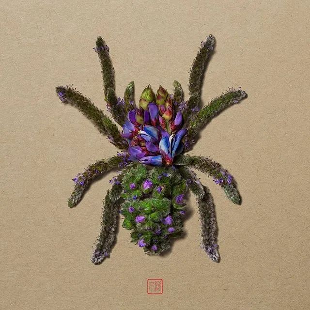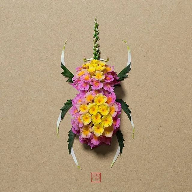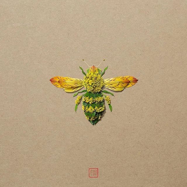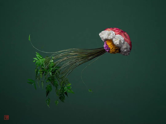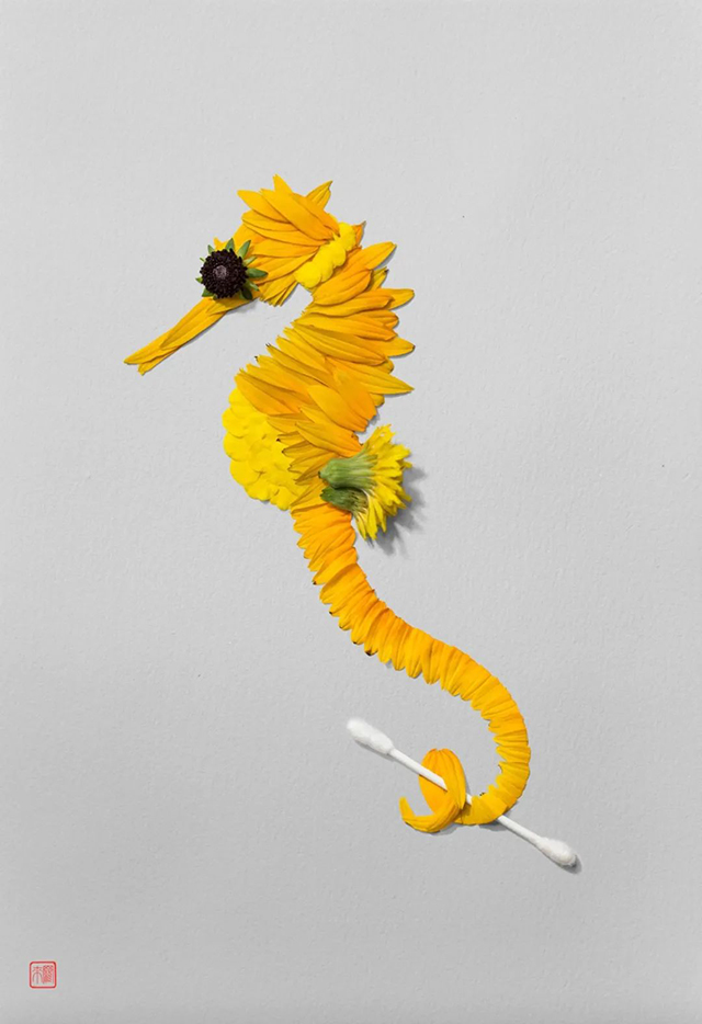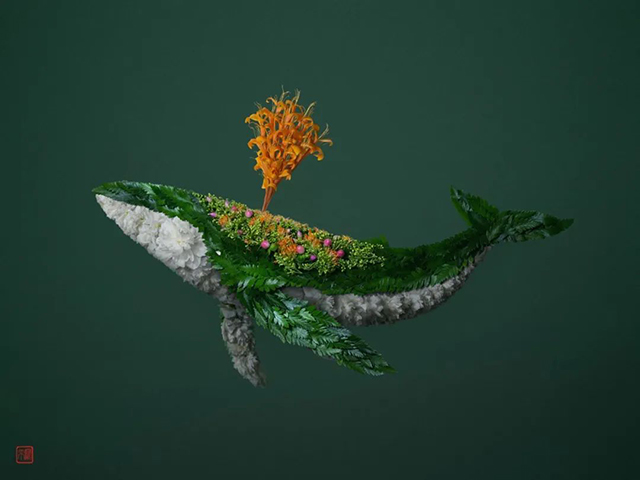 井上罗来(Raku Inoue)以其对甲虫、昆虫和蝴蝶的植物学排列而闻名,他再次将动植物聚集在一起。他之前的作品经常把动物摆成固定的姿势,就像把猫头鹰或蝎子的肖像别在一个玻璃盒子里,作为收藏品的一部分。不过,他的Natura Wildlife系列的最新作品中显示了一种活泼和动感,从鲸鱼的气孔喷出橙色花朵到一只海马抓着棉签。