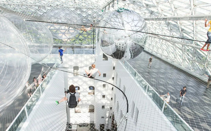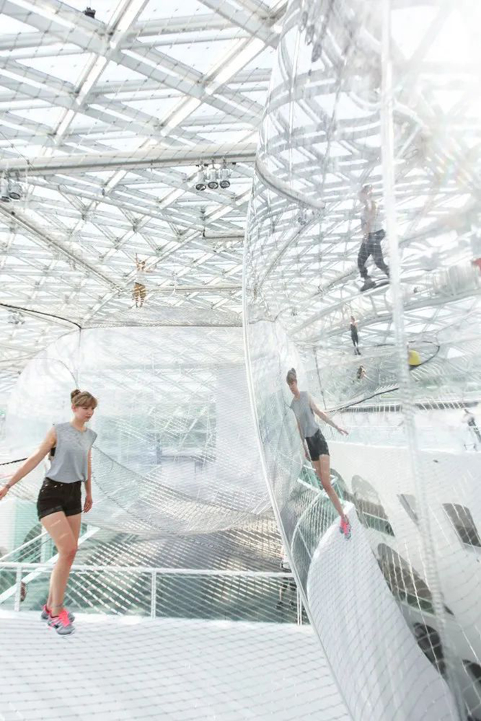 你有没有试过在梦里飞起来,悬浮在空中俯瞰大地?艺术家Tomas Saraceno将这飘渺虚幻梦境变为了现实。他所设计的大型艺术装置“In Orbit”以钢索编织成网,上面又放置了多个透明大球,范围超过2500平方英尺,参观者可以进入这个“空中之城”,尽情感受高空“悬浮”的乐趣。