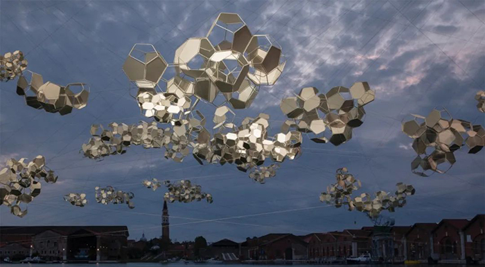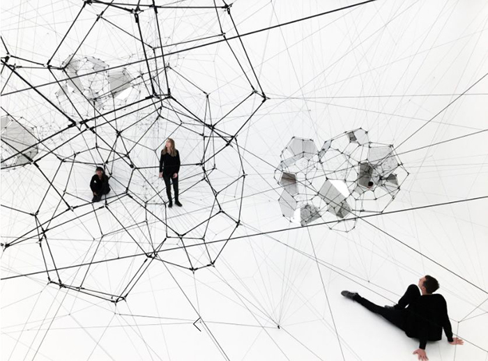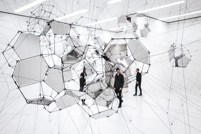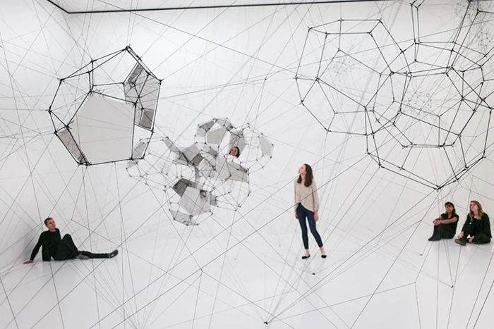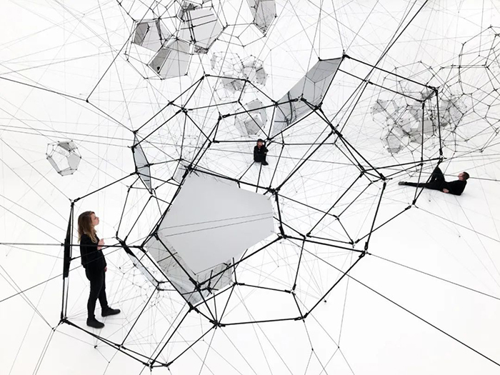 《Stillness in Motion — Cloud Cities》则是人造蜘蛛网的升级版,其在某些金属框架平面上镶嵌了镜面板。
