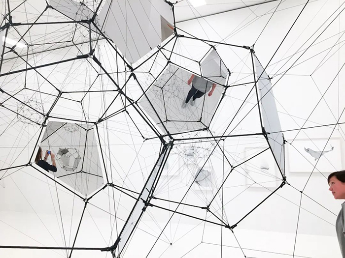 这件作品由模块相互紧扣而成,几何体的每个五边形平面由金属框架构成,部分平面镶有与金属框架齐平的镜子,部分平面空置。参观者可以从中看到作品内部用来固定平面的绳网,以可视化的方式展现了绷紧的物理力量。