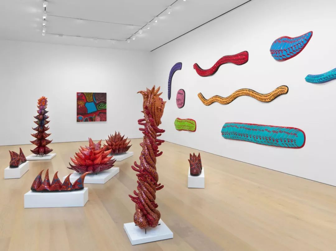 卓纳画廊在纽约再度呈献草间弥生的新作展,汇集了艺术家最新的油画、雕塑及沉浸式装置创作。本次展览还揭幕了一件全新的镜屋作品《无限镜屋——飞向宇宙的舞动灯光》,为观众打造出一个沉浸式的、富有诗意的无垠空间。摇曳的灯光被镜面无限地反射,再次强调了草间弥生的创作生涯中一以贯之的信念——“无限永恒的宇宙(与)不朽的相互关系”。