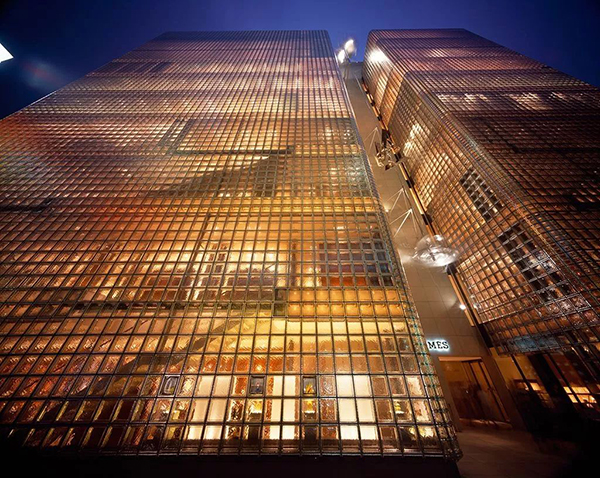 11层楼高的〈银座MAISON HERMÉS〉,大楼外壁以一万多块的意大利进口玻璃砖集结而成,而且四块玻璃砖的大小恰如一张展开的HERMÉS丝巾足具巧思。大楼在昼夜各自展现不同暧昧的奢华风貌,白日内部空间通透明亮,尤其在夜晚又像是银座区的大灯笼般低调优雅地闪闪发亮。