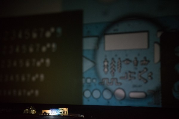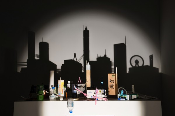 桑久保亮太让一台有着LED光源的玩具小火车,缓慢行走在全黑的空间里,各种微物投射放大后,成了熟悉又陌生的巨大图像,洗衣夹是电线杆、洗菜篮是建筑物、书挡成为鲜明桥梁,犹如电影般的场景随即而生……