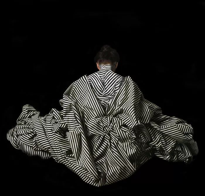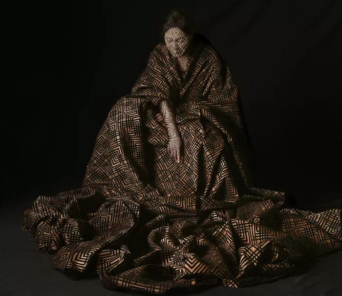 Paredes使用背景同款布料,或直接在皮肤上绘制和背景相融的图案,像变色龙一般隐藏自己,有时她又会露出头发,让观者意识到她的存在。
