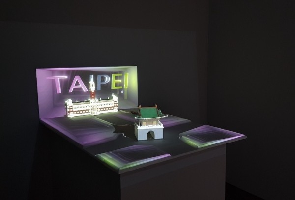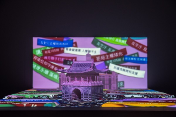 光雕动画师曾士豪,将目光聚焦景福门至总统府,这个场域时常汇集人民意识、议题声量,宛如一个实体的PTT。他在两座立体建筑上投射出故事流动、搭配音乐与人声,在人民走上街头、口号布条满天飞中,分别以粉色、绿色强调人权、环保议题。