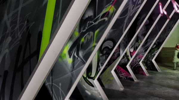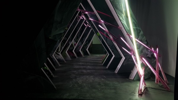 藏在展间最后方,如同城市里一处隐蔽街角,「亚洲最强涂鸦客」Debe将涂鸦「夜袭创作」的精神带入展场,用9个灰色菱形格栅构筑起可穿越的信道,现地涂鸦创作;格栅上妆点着绿、粉色的流线灯管,呈现城市里繁忙车流的意象。