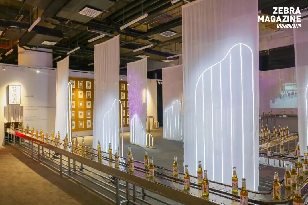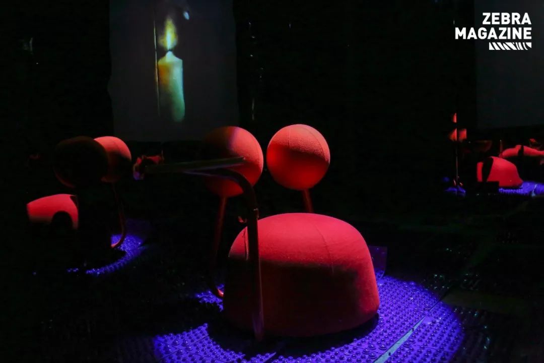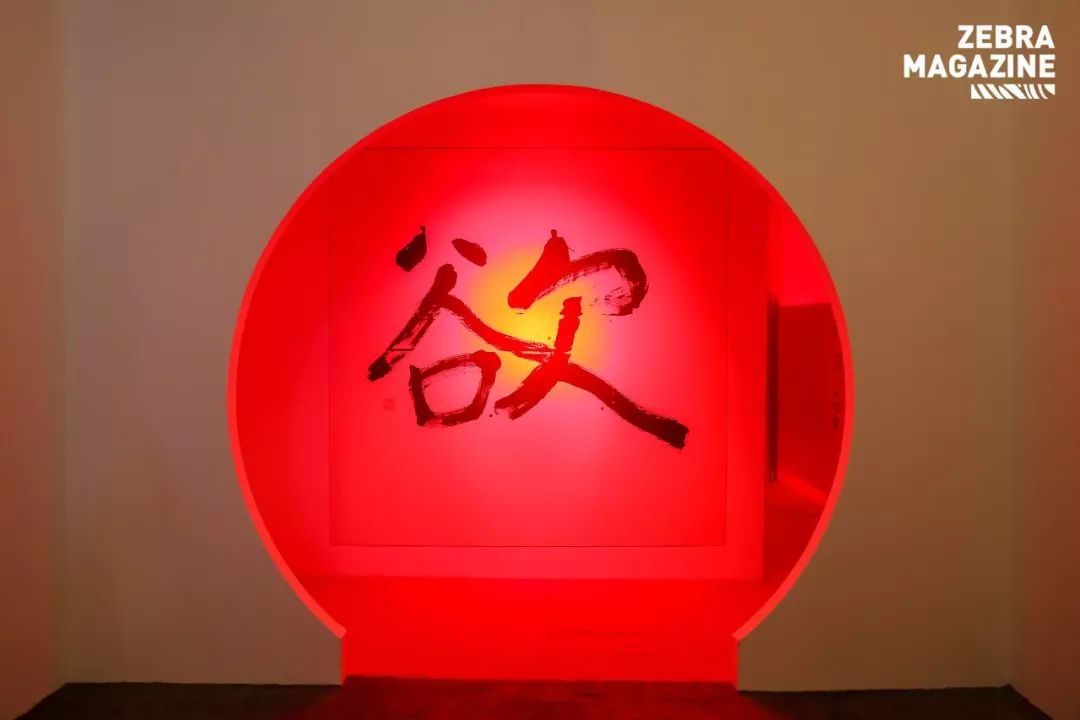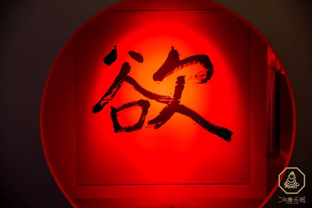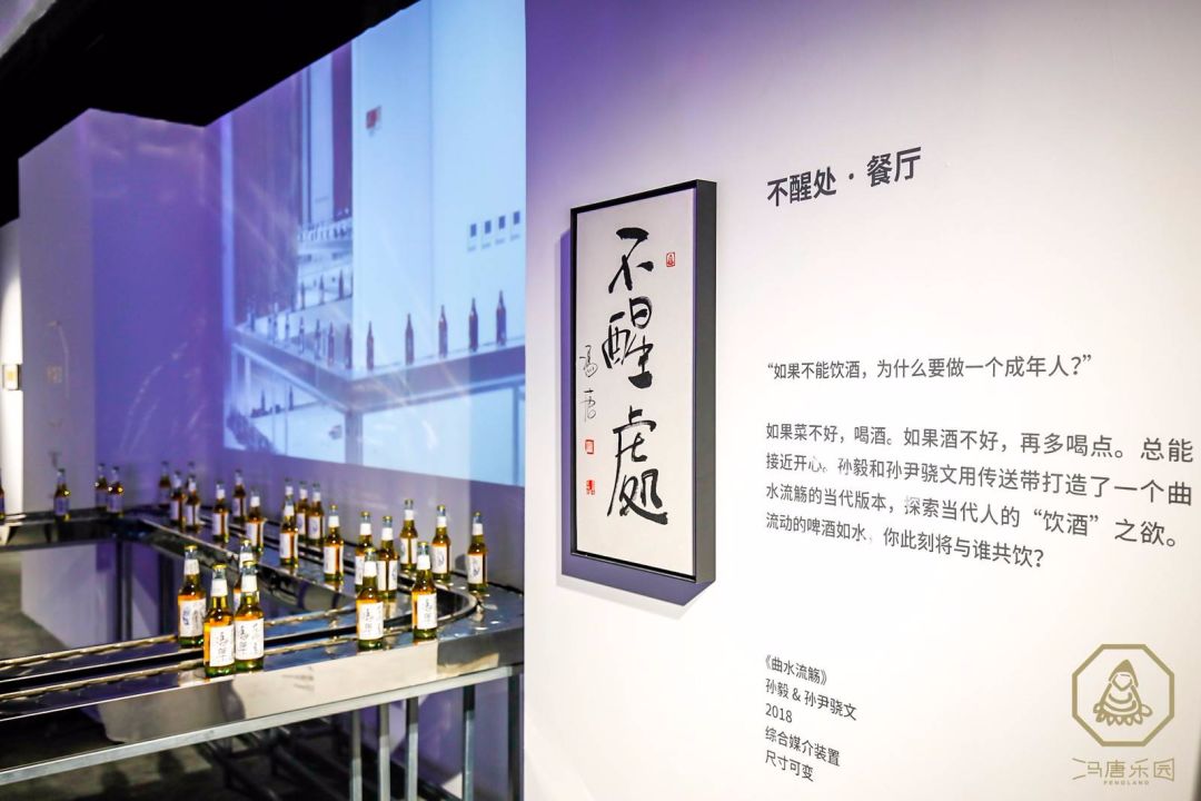 在步入六大空间的入口处,你将会看到一个硕大“欲”字,作为本次展览的主题。而由于场地原因,此次展览的花园与餐厅并为了一处,形成一幅更具有诗意的“饮酒作乐”画面。以数件帷幔和霓虹灯装置精心构建而成的寺庙园林景观,模糊了虚实边界。在园林中曲折蜿蜒的则是现代版的“曲水流觞”,艺术家通过传送带机械装置运送啤酒。“在机械化生产的当代,究竟要吃什么才能让我们感到幸福?”这一问题值得探讨与深思。在此次展览中,传送带的啤酒供观众饮用,探索当代人“饮酒”之欲。现场还可以以自己的幸运数字求签,来解答心中的困惑。在餐厅的边上还设有一处“乐园酒吧”,在定期举办的活动时会提供香槟。冯唐酷爱香槟配煎饼,他认为,三十岁之前的饱腹靠煎饼,三十岁之后的忧愁靠香槟。
