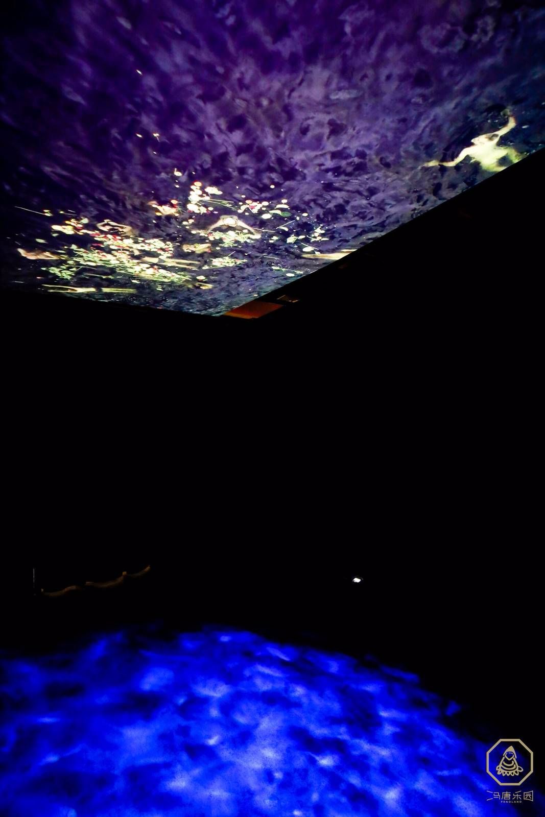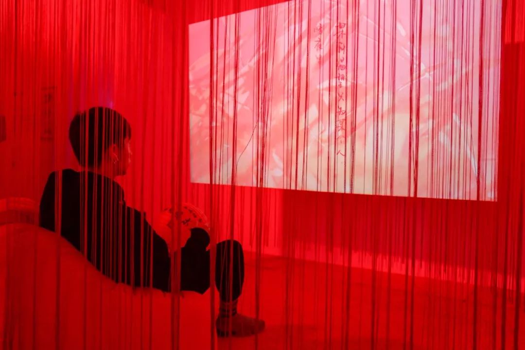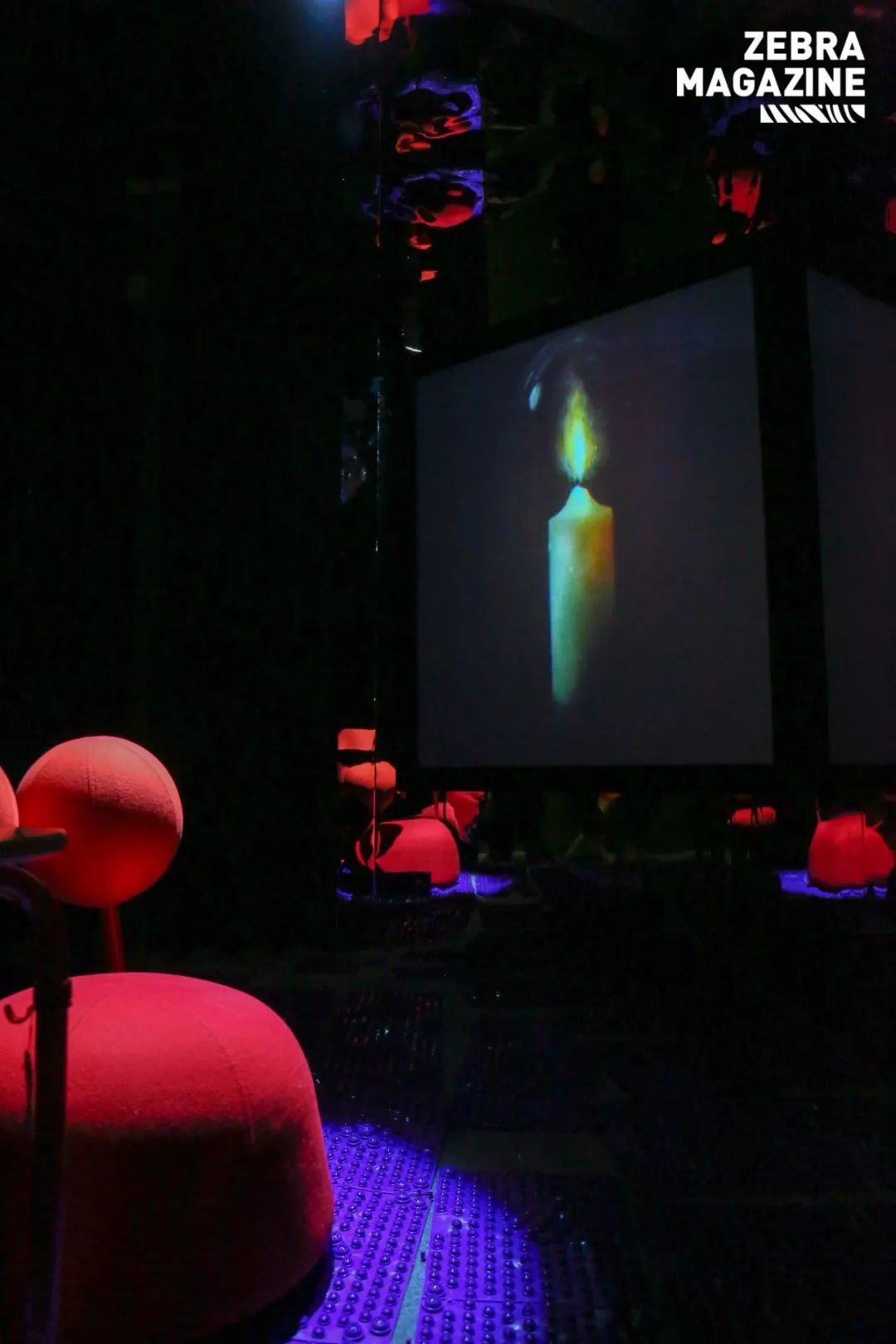 在步入六大空间的入口处,你将会看到一个硕大“欲”字,作为本次展览的主题。而由于场地原因,此次展览的花园与餐厅并为了一处,形成一幅更具有诗意的“饮酒作乐”画面。以数件帷幔和霓虹灯装置精心构建而成的寺庙园林景观,模糊了虚实边界。在园林中曲折蜿蜒的则是现代版的“曲水流觞”,艺术家通过传送带机械装置运送啤酒。“在机械化生产的当代,究竟要吃什么才能让我们感到幸福?”这一问题值得探讨与深思。在此次展览中,传送带的啤酒供观众饮用,探索当代人“饮酒”之欲。现场还可以以自己的幸运数字求签,来解答心中的困惑。在餐厅的边上还设有一处“乐园酒吧”,在定期举办的活动时会提供香槟。冯唐酷爱香槟配煎饼,他认为,三十岁之前的饱腹靠煎饼,三十岁之后的忧愁靠香槟。