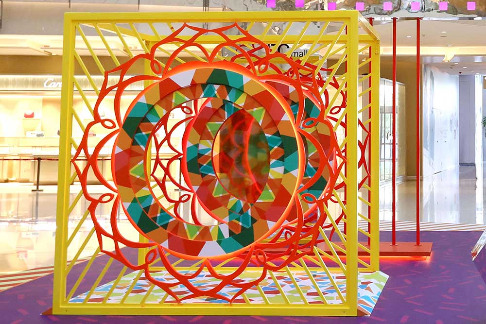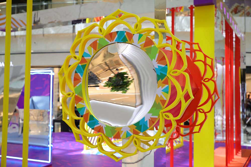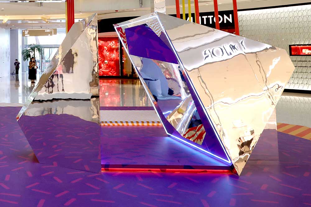 在商场一楼中庭,大型万花筒艺术装置【鎏光溢彩万花筒】呈现出璀璨夺目的光彩,给予视觉突破性的震撼体验,营造美轮美奂的艺术氛围。创作装置结合艺术、镜面和动画投影等多种艺术特效,为顾客营造光影变幻的重构世界,带来独特的视觉享受与感官体验,打造商场成为炫丽梦幻的万花筒艺术之境。