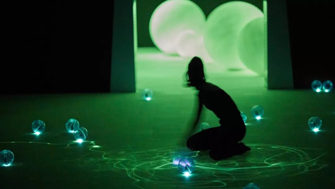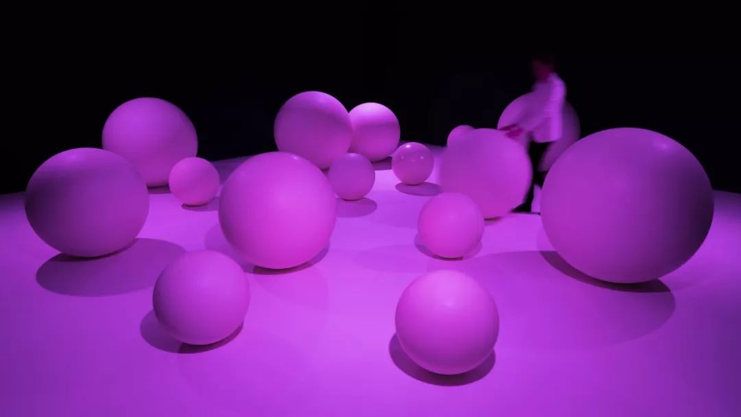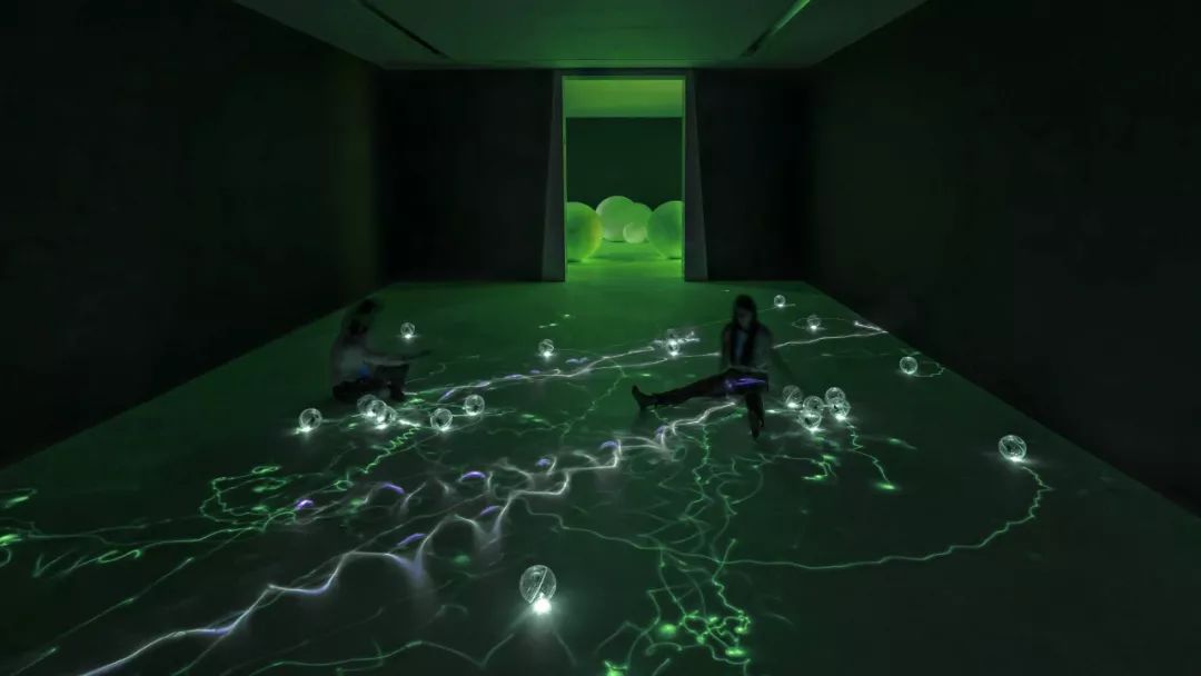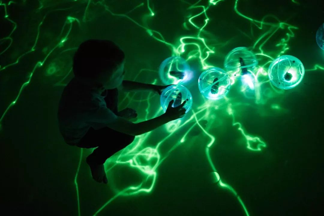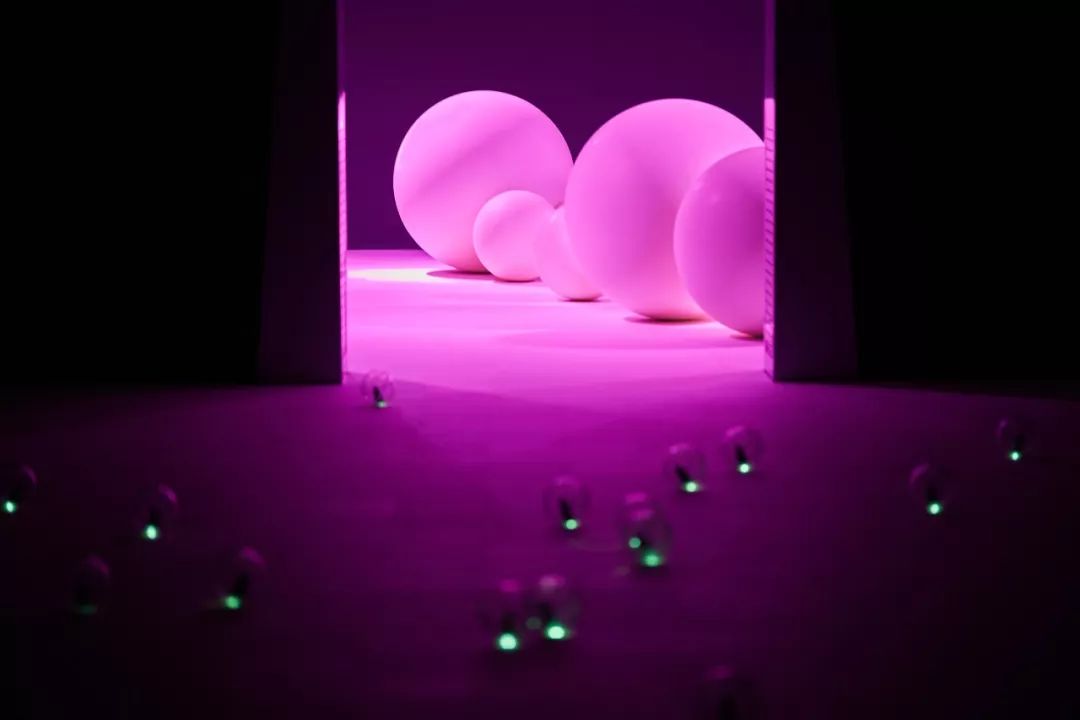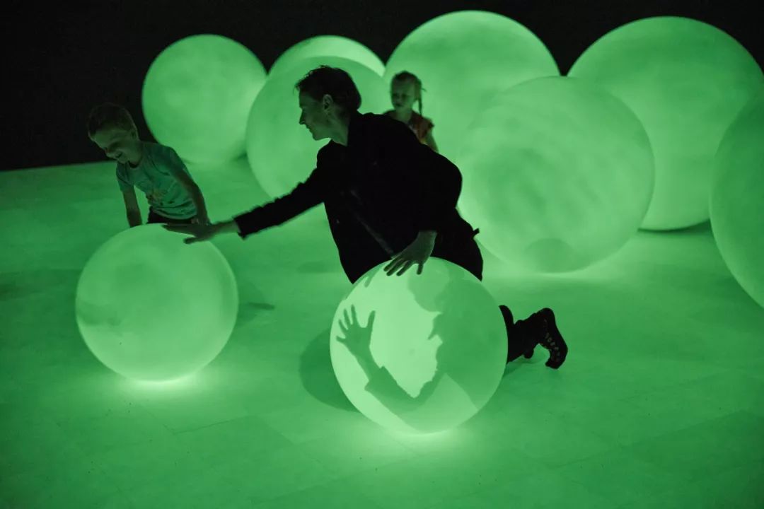 还有一个房间,把大球体和在展览中其他地方发现的拍照灯光效果结合在一起。最后,还有一个房间,里面放着水母状的球,以帮助设计它们的实习生洛拉斯(Lolas)的名字命名。当被推来推去时,罗拉斯会在黑暗的地面上留下绿光的触须,邀请游客来画图案或写单词。