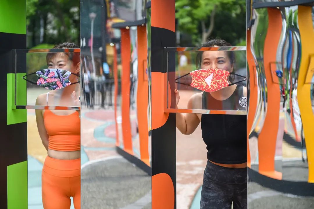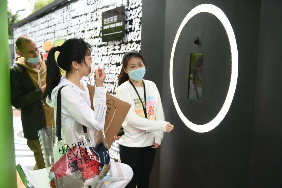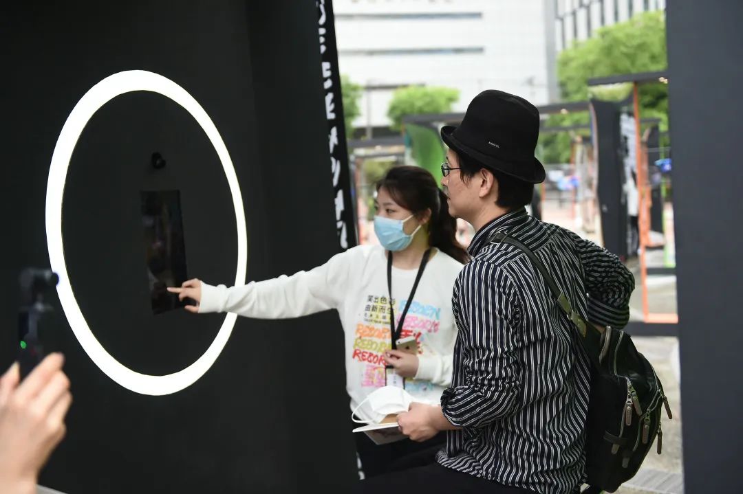 这里有个独特的半开放空间,非常有趣,当人们步入其中,触动屏幕,便可启动AR互动艺术口罩拍摄装置。