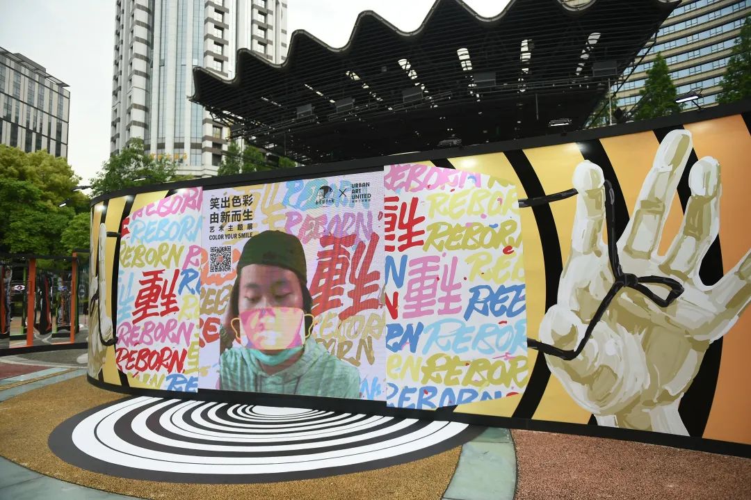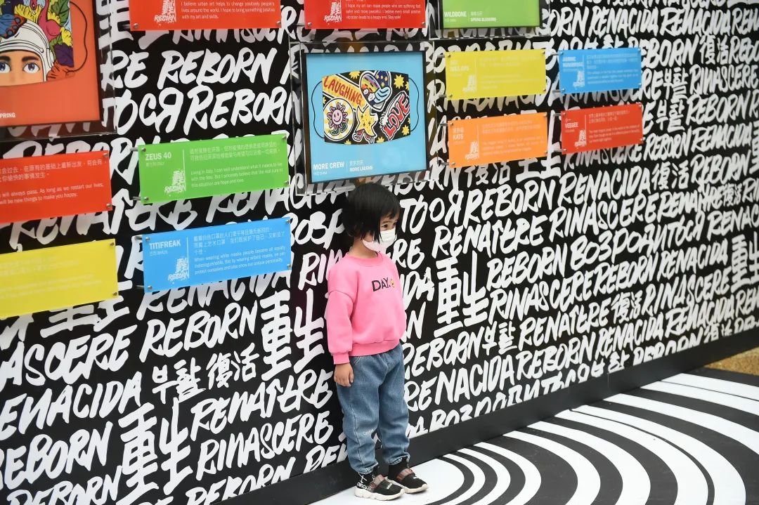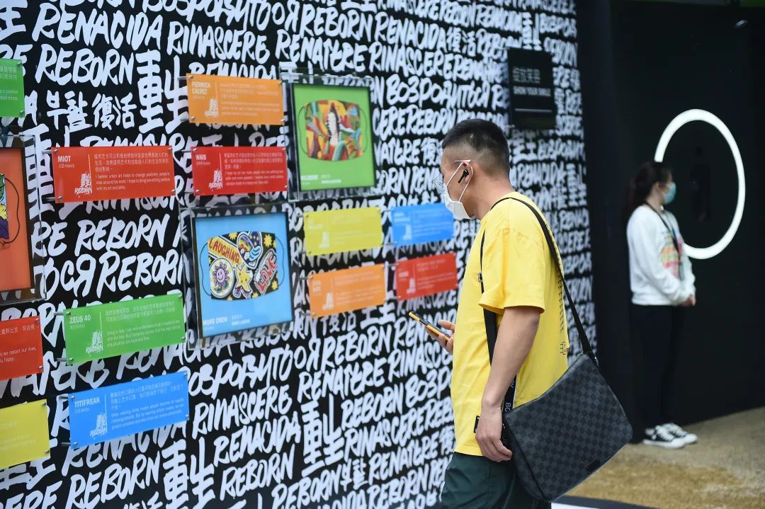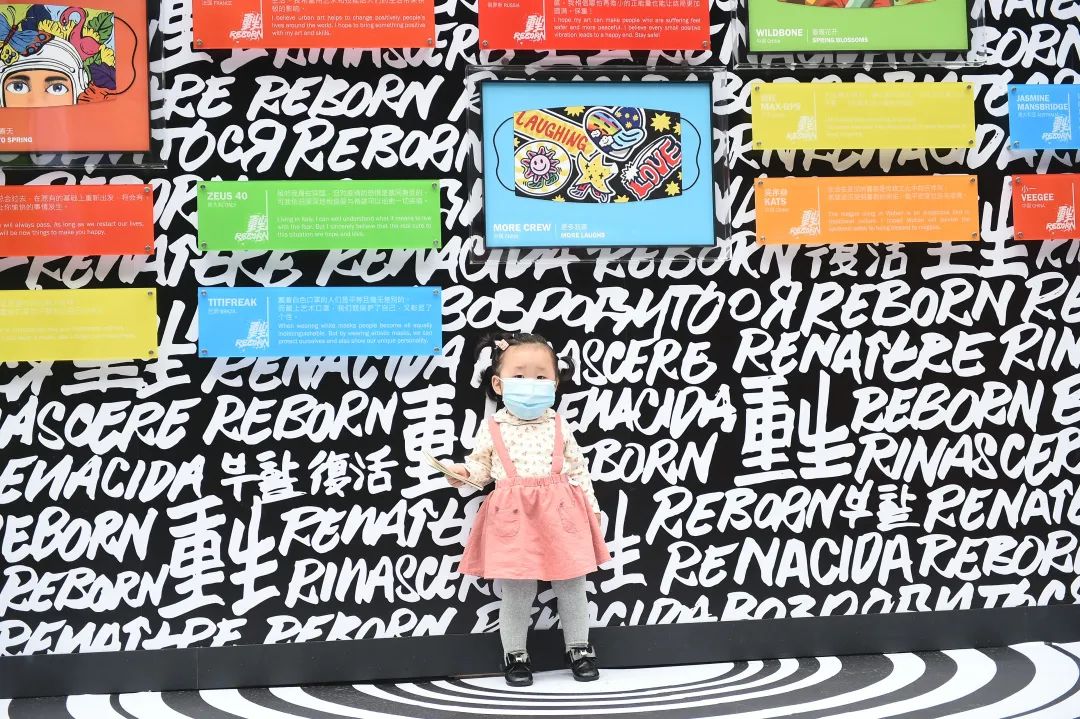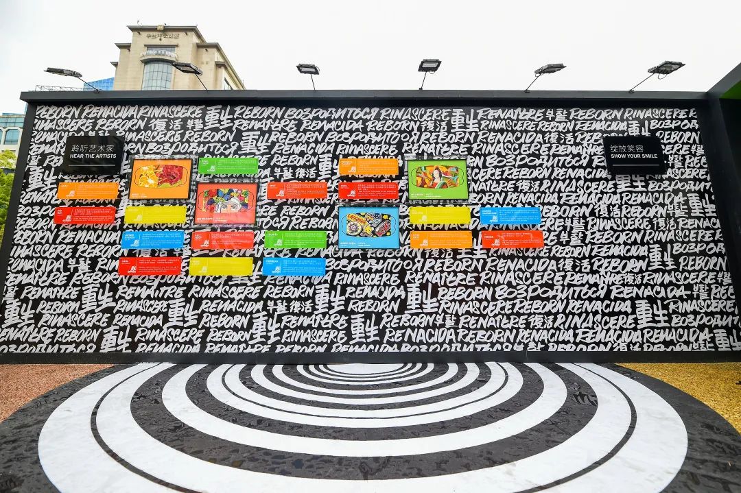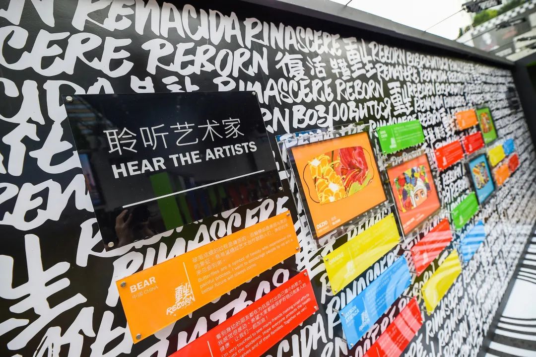中心艺术墙由8种(汉语,法语,英语, 西班牙语,意大利语,俄语, 日语,韩语)不同语言书写的“新生”组成,围绕在艺术衍生品周围的是来自各个国家的艺术家的寄语,表达着来自全球的美好问候。