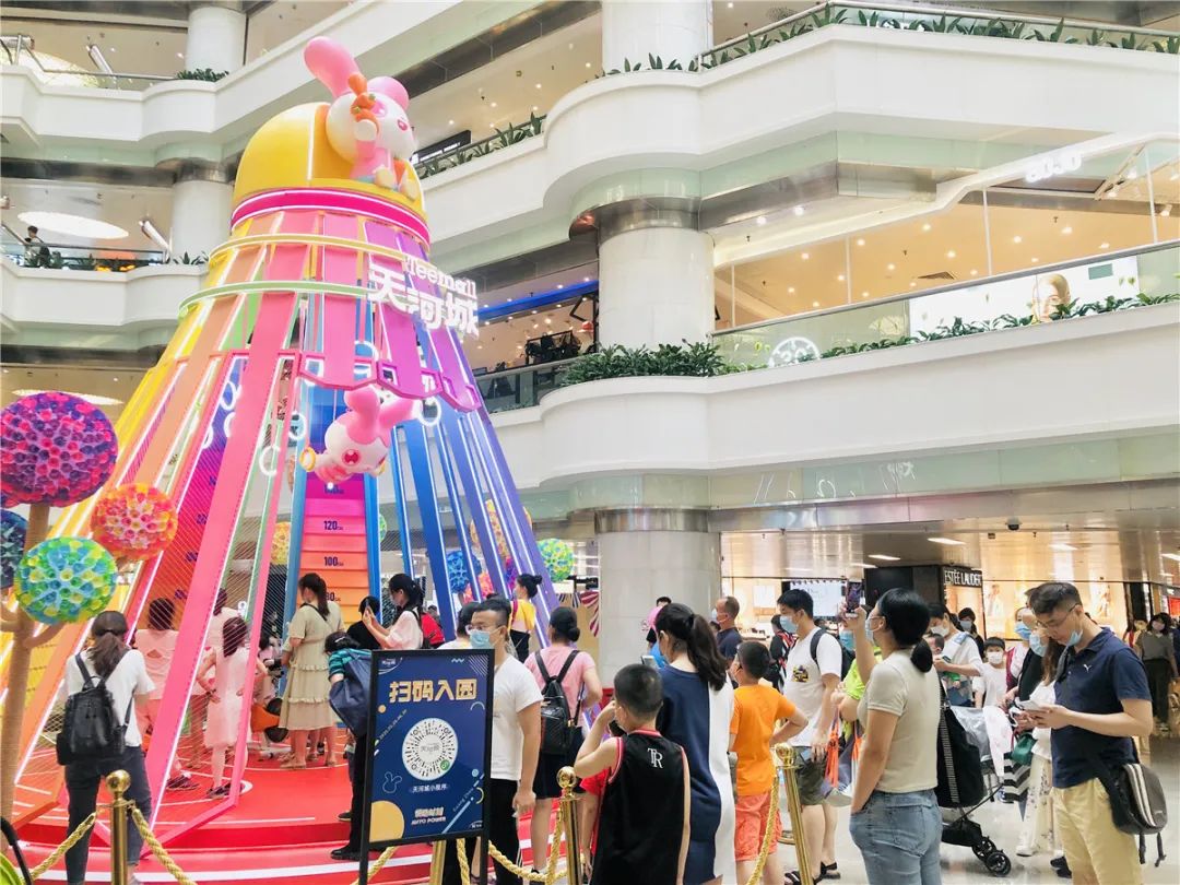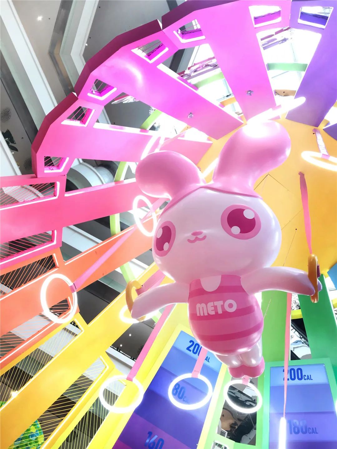 跟随METO雀跃的脚步来到一楼中庭,映入眼帘的是一只高达7米的精致巨型羽毛球,顶部还有一只活泼可爱的METO捧着最爱的胡萝卜欢迎你加入夏日运动营!走进羽毛球造型内部,METO竟然还在闪闪发光的吊环上旋转跳跃,炫耀它柔韧的身姿。球体正中央,三辆动感单车在此恭候爱运动的你加入“单车挑战”,LED屏幕上呈梯形分布着你燃烧的卡路里数字。跟着METO一起运动,让多巴胺上线吧,来一场与数字的较量,与卡路里fighting到底!