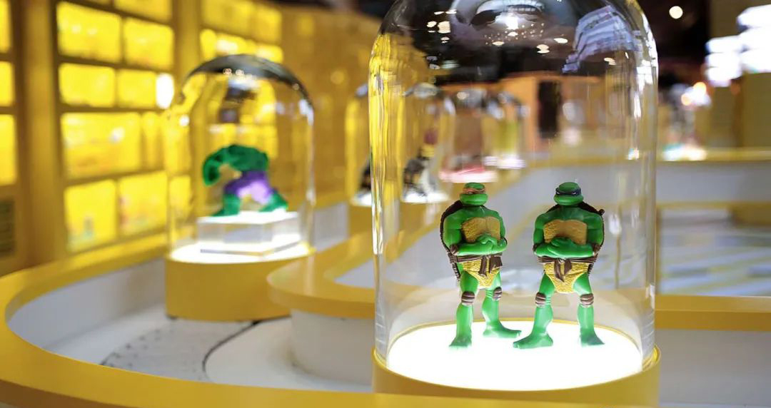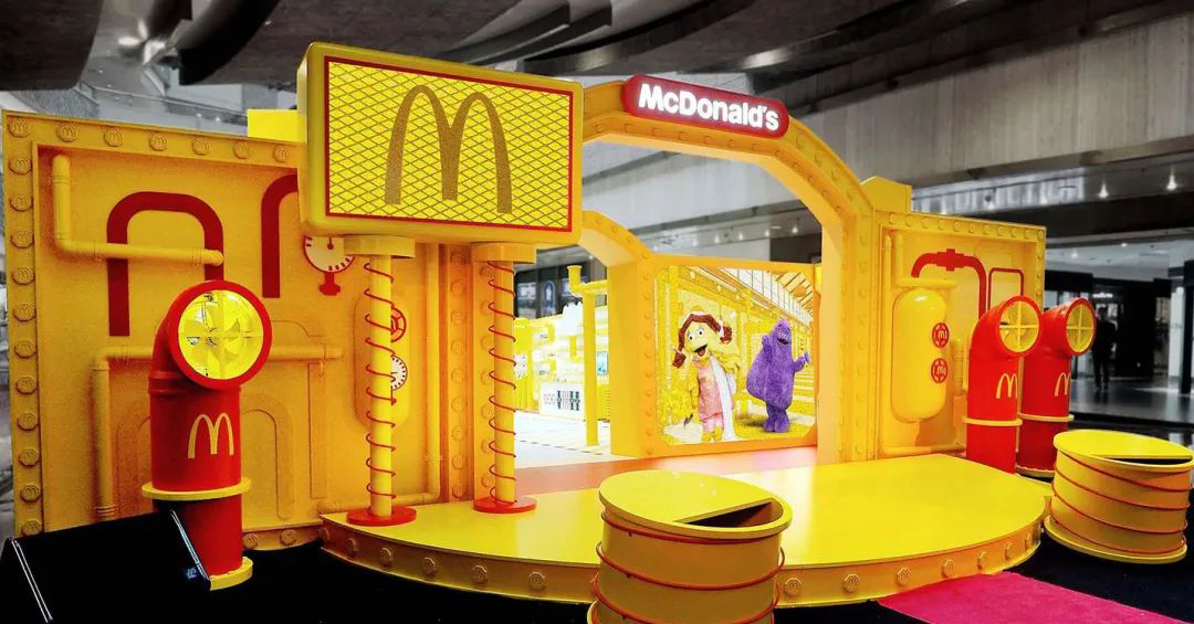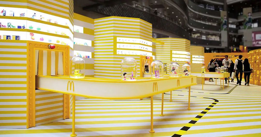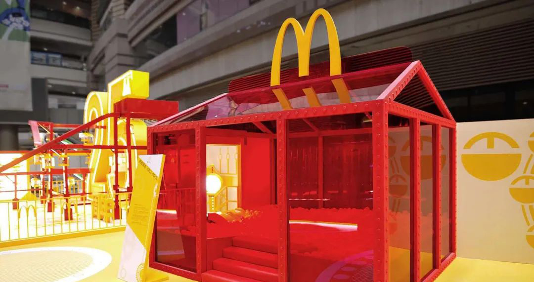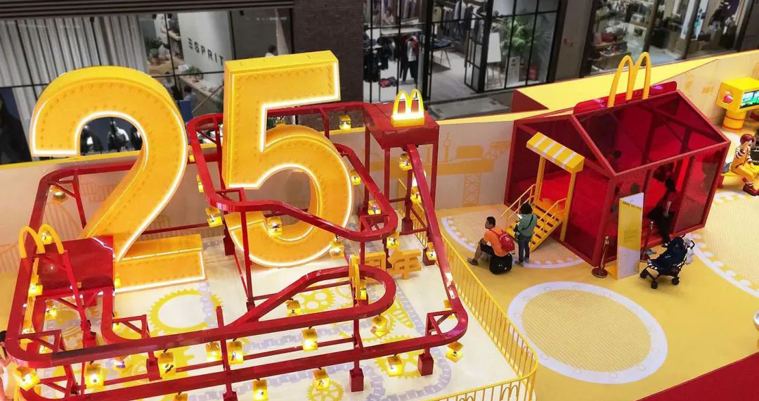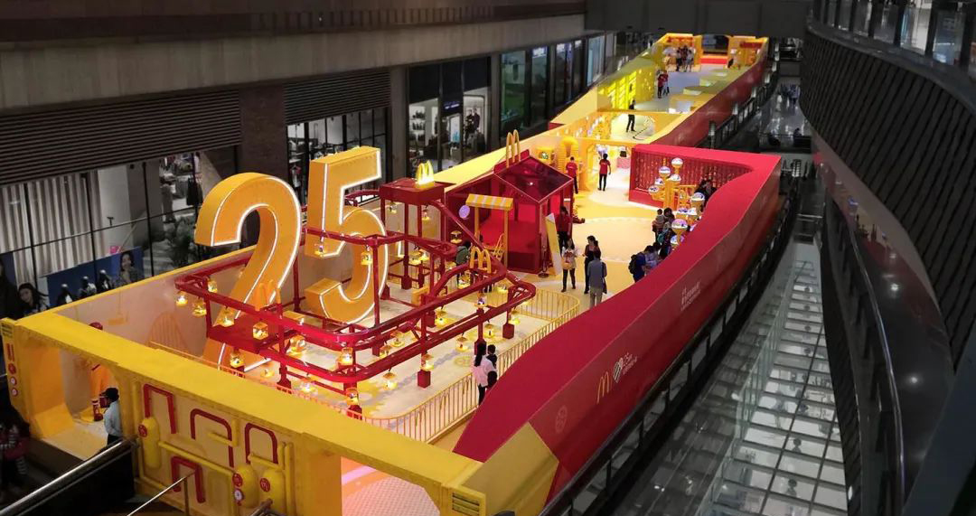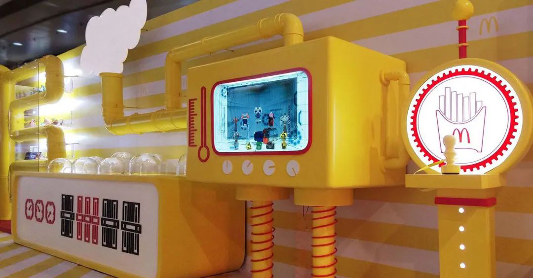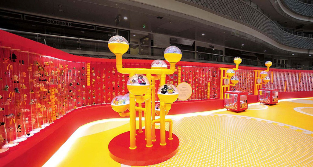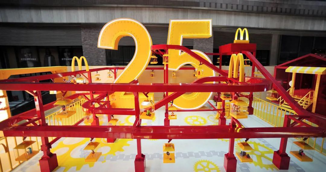为了庆祝麦当劳进入中国大陆25周年,麦当劳中国以“制造幸福的玩具工厂”为主题举办了一个玩具展览,与大家分享25年的快乐。 展览展示了麦当劳来自世界各地发行的2500多件玩具,设计师以“工厂”为设计概念,将传送带、吊车塔、仪表盘和管道等工厂生产线的元素贯穿展览始终不仅仅是作为装饰,而是作为展示方式体现玩具的运动感。