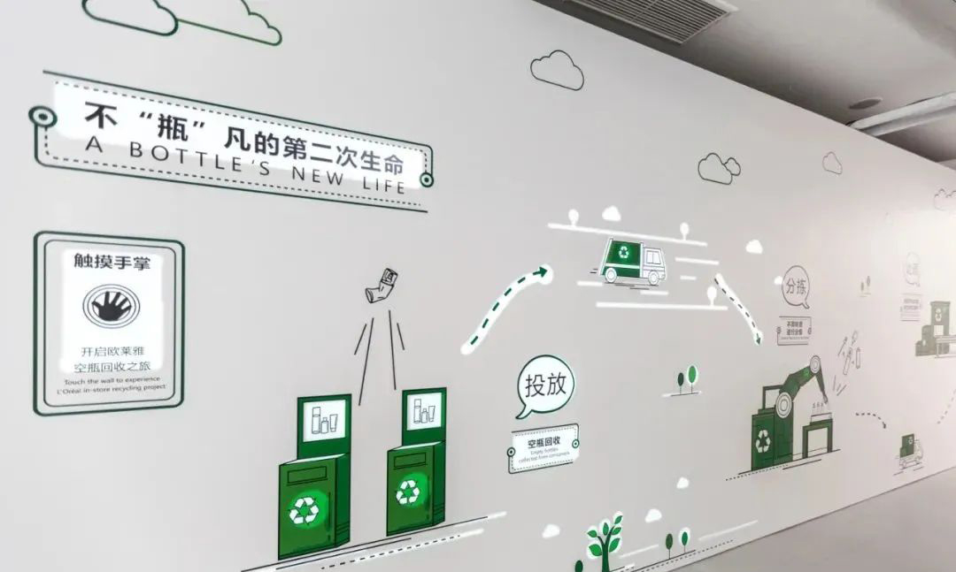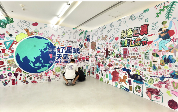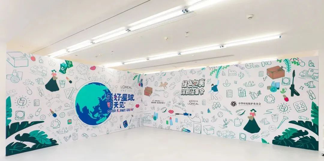 在展览的最后,欧莱雅为观展者置了一面“美好”涂鸦墙,留下对这个星球美好明天的祝愿,观展者还可以定制专属自己的“绿色包裹”,打卡明星同款“美好星球”宣传照。
