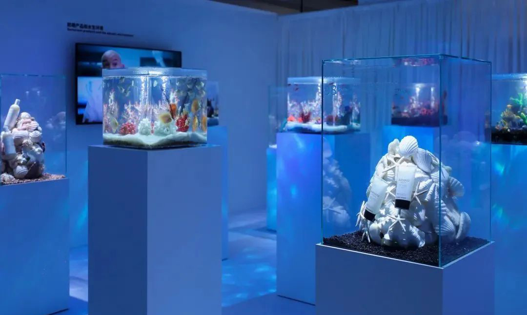 在“守护蔚蓝”展区 ,欧莱雅将产品与海洋生物相结合,天然、环保正是欧莱雅想说的。