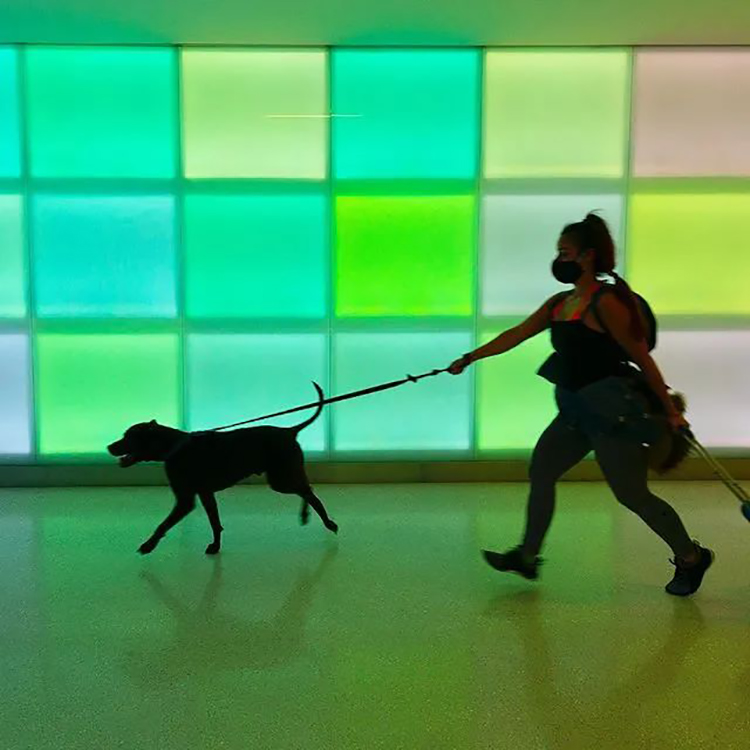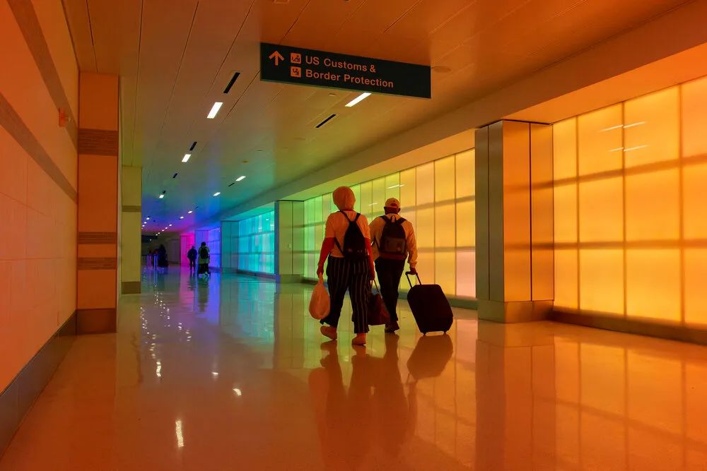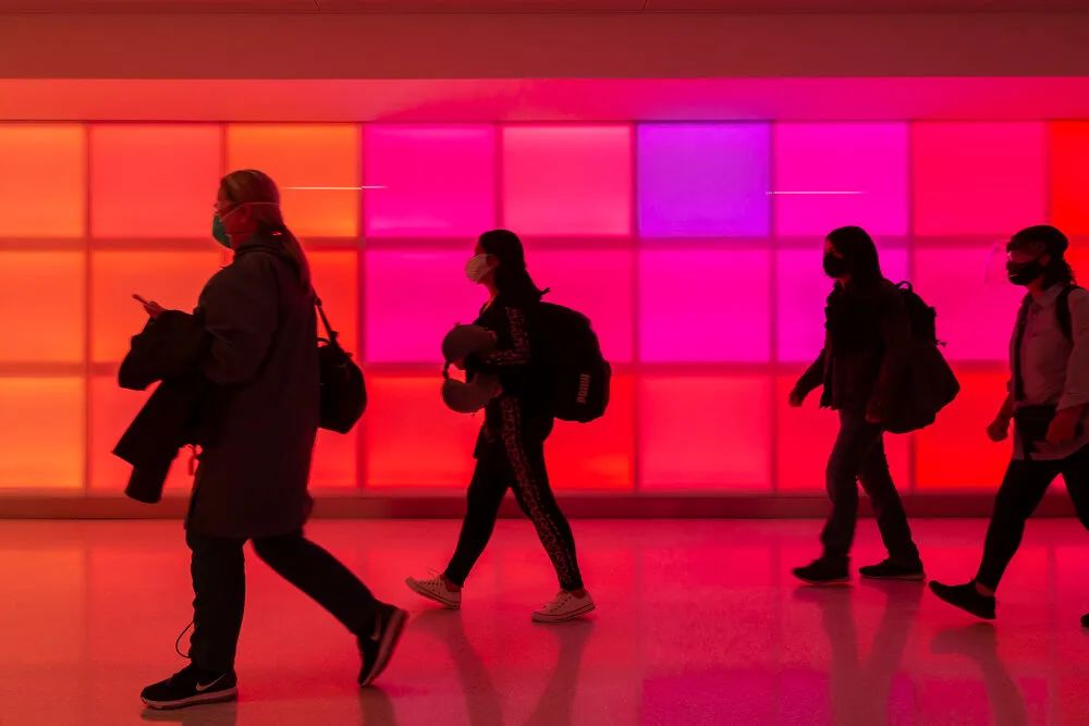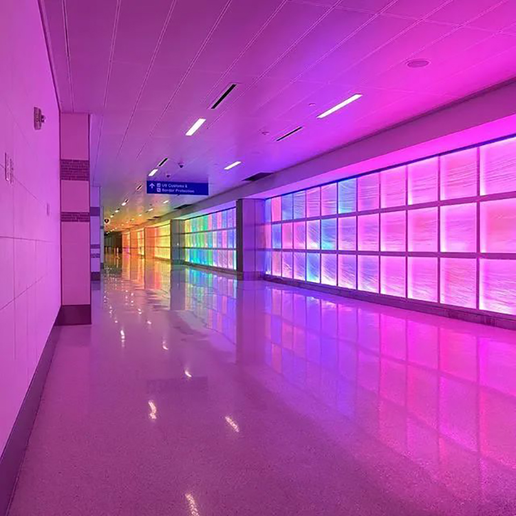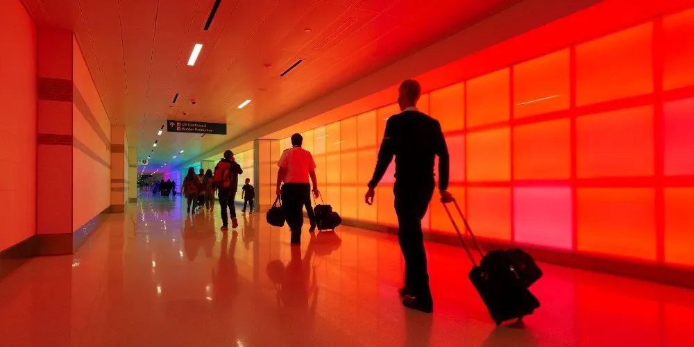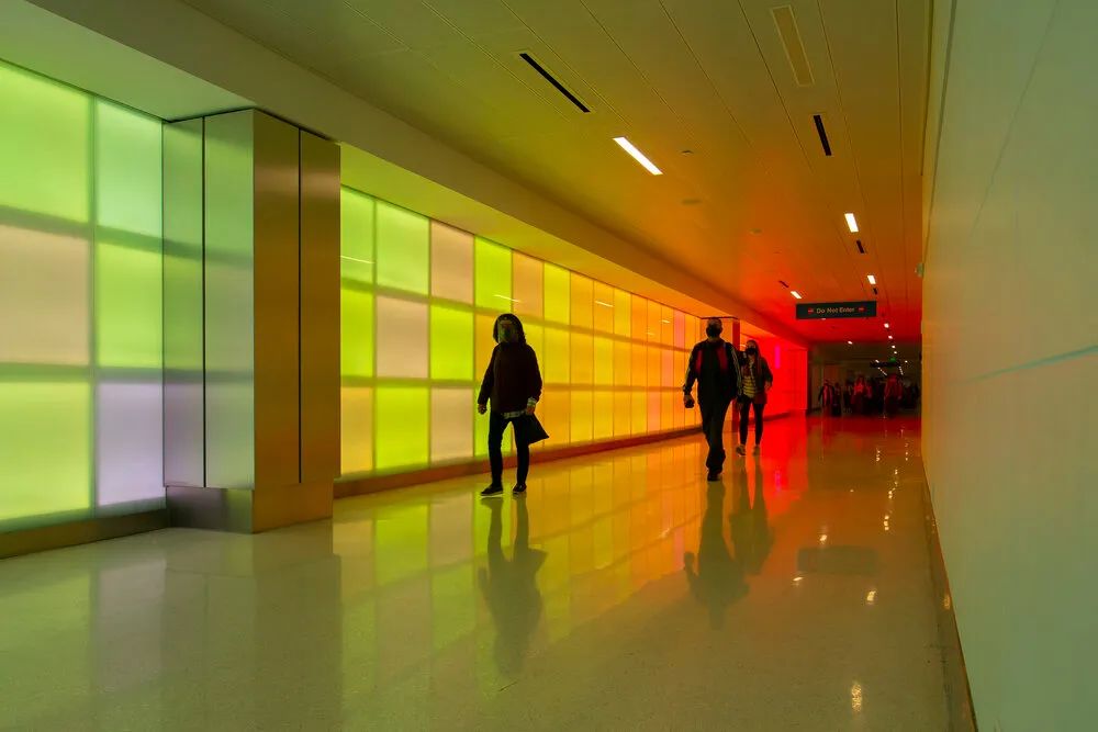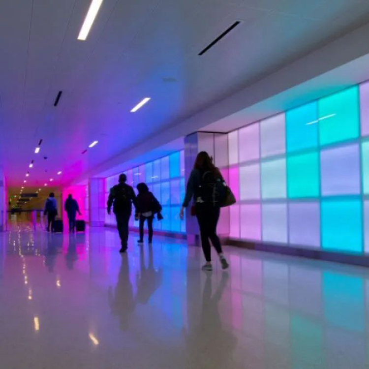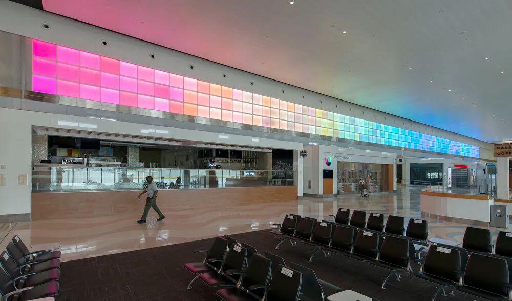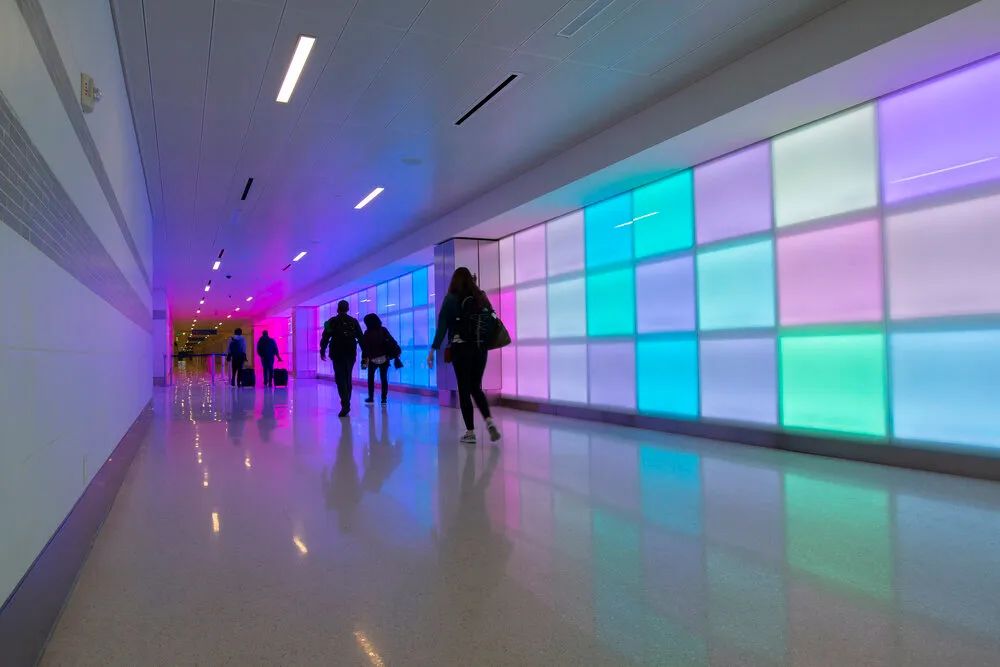 由洛杉矶艺术家卡梅隆·麦克纳尔(Cameron McNall)设计的240英尺长彩色LED灯显示屏,是佛罗里达州南部劳德代尔堡-好莱坞国际机场(FLL)永久性展出的最新公共艺术作品。此装置艺术作品名为Mosaic,将FLL的4号航站楼走道转变为沉浸式的色彩和光度体验。